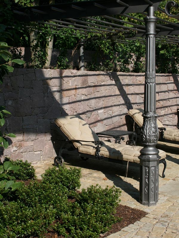 Der Liegeplatz ist besonders gut geplant, da der Rücken nach der Feng Shui Lehre gut geschützt ist durch die stattliche Natursteinmauer. Zudem speichert der rötliche Mittweidaer Granit die Sonnenwärme ab, sodass der Liegeplatz bis in die Abendstunden angenehm warm ist.