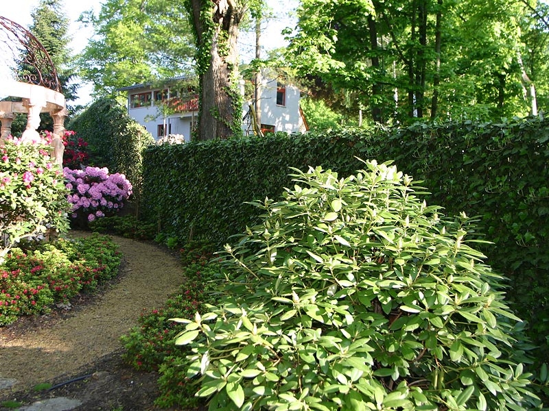 Die mobile Efeuhecke schirmt den Park vor neugierigen Blicken ab. Üppig blühende Rhododendren bringen Farbe in den Gartenpark.