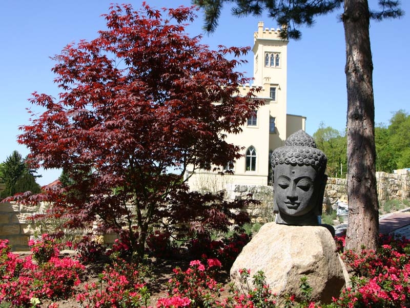 Herrliche Aussichten bietet dieser Gartenpark in seinem japanischem Bereich. Der Blick auf das Keppschloss wird untermalt mit blühenden Azaleen.