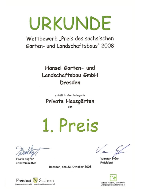 1. Preis im Wettbewerb „Preis des sächsischen Garten- und Landschaftsbaus“ 2008 in der Kategorie „Private Hausgärten“
