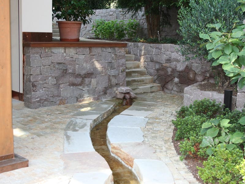 Wie ein natürlicher Bach, der aus einem Fels entspringt, wirkt dieser Bachlauf, neben dem ein weiterer Weg des Gartens verläuft.