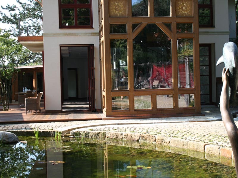 Das Badehaus mit dem herrlichsten Blick in den Gartenpark. Gleich neben dem Teich erstreckt sich eine großzügige Sonnenterrasse.