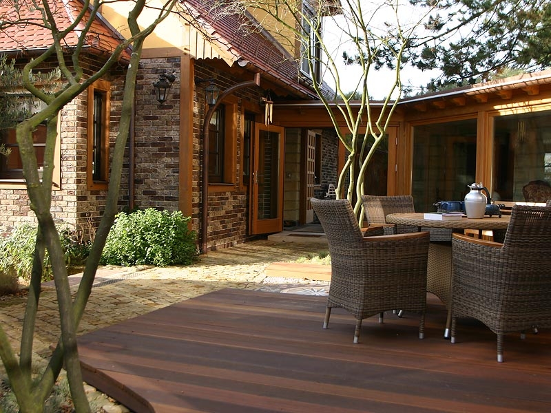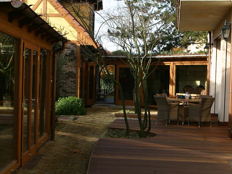 Bereits beim Bau des Badehauses durften wir mitreden. Das Badehaus wurde genau so errichtet, dass man ebenerdig auf die großzügige Terrasse mit Innenhofcharakter gelangt.