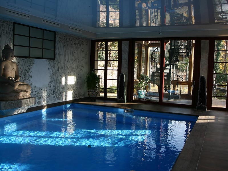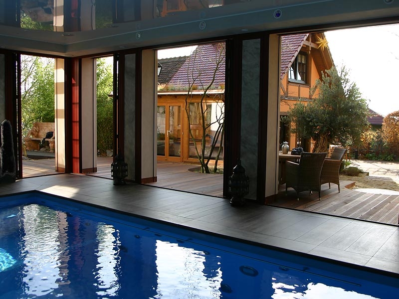 Vom Schwimmbecken hat man von 3 Seiten einen sehr schönen Blick in den Garten, die Fenster des Schwimmbads sind bodenlang zu öffnen, so dass man sich im Sommer fast wie in einem Freibad fühlt.