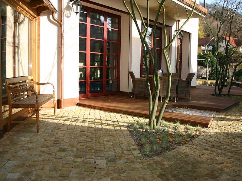 Das Holzdeck wird aufgelockert zum einen durch ein Steinmosaik, zum anderen durch Schirmamelanchien, die aus ihm „herauswachsen“. Der natürliche Farbton des Sandsteinpflasters passt sehr gut zum Holzfarbton.