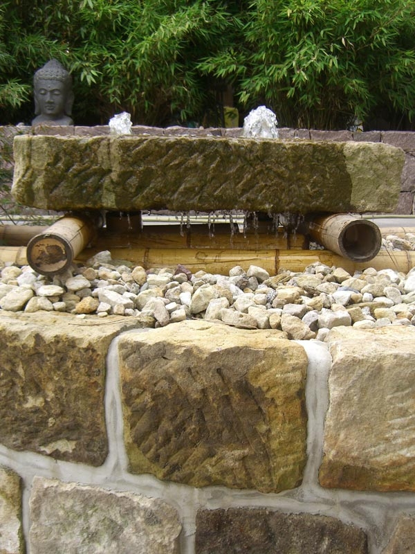 Der Sandsteinfindling schwebt auf Bambusstangen, ein schönes Detail.