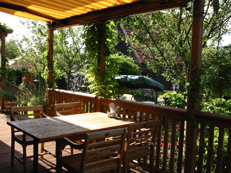 Die höher gelegende rund um das Haus verlaufende Veranda bietet einen sehr geschützten, sonnigen Sitzplatz mit Blick in den Bauerngarten.
