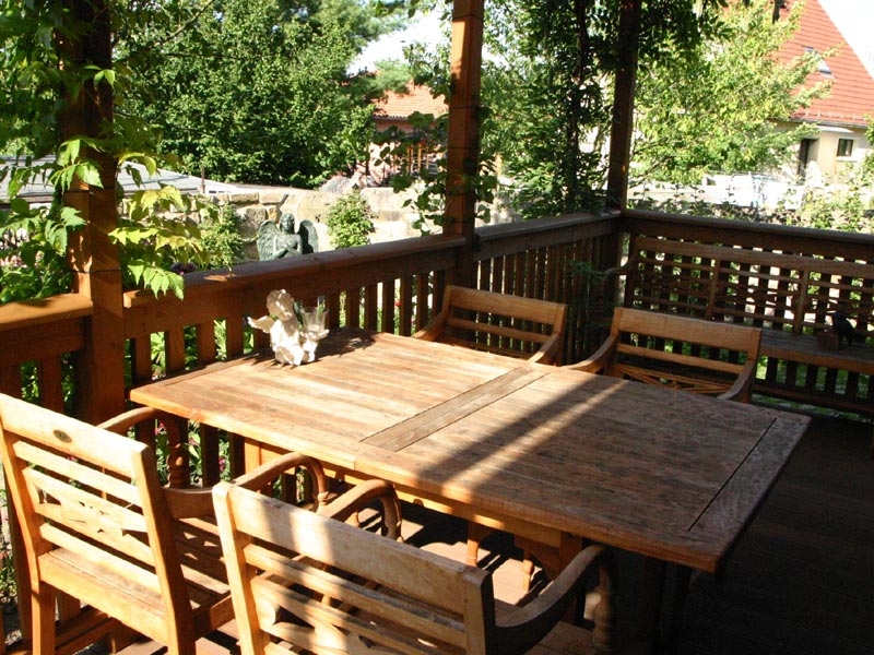 Die nachträglich an das Haus gebaute großzügige Holzveranda ist das zweite, grüne Wohnzimmer.