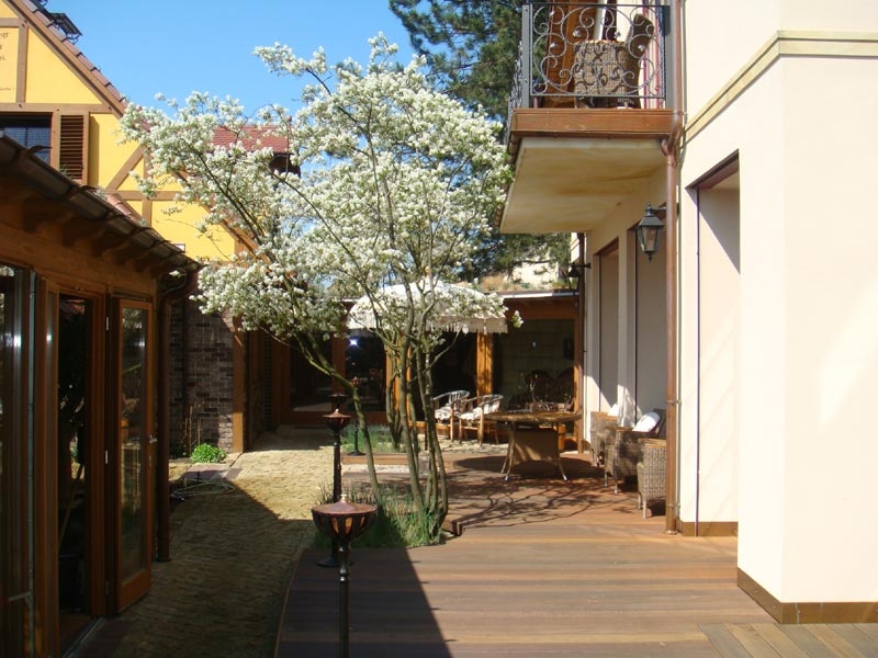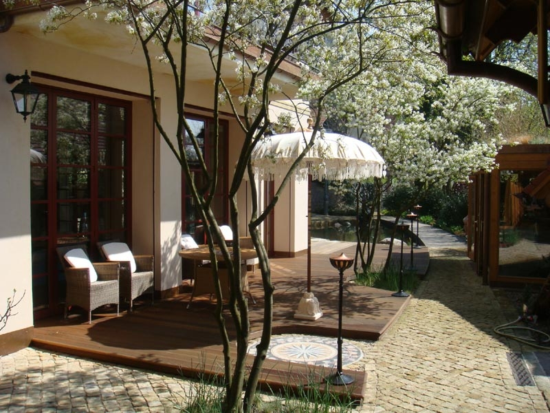 Aus der Holzterrasse vor dem Badehaus wachsen prächtige, filigrane Amelanchien (Felsenbirne), die als Schirm bereits in der Baumschule vorgezogen wurden. Sie verbreiten einen angenehm lichten Schatten.
