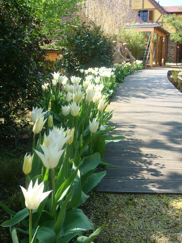Weiß blühende Tulpen umsäumen den Holzsteg, der über einen Teich zur Terrasse des Badeshauses führt.
