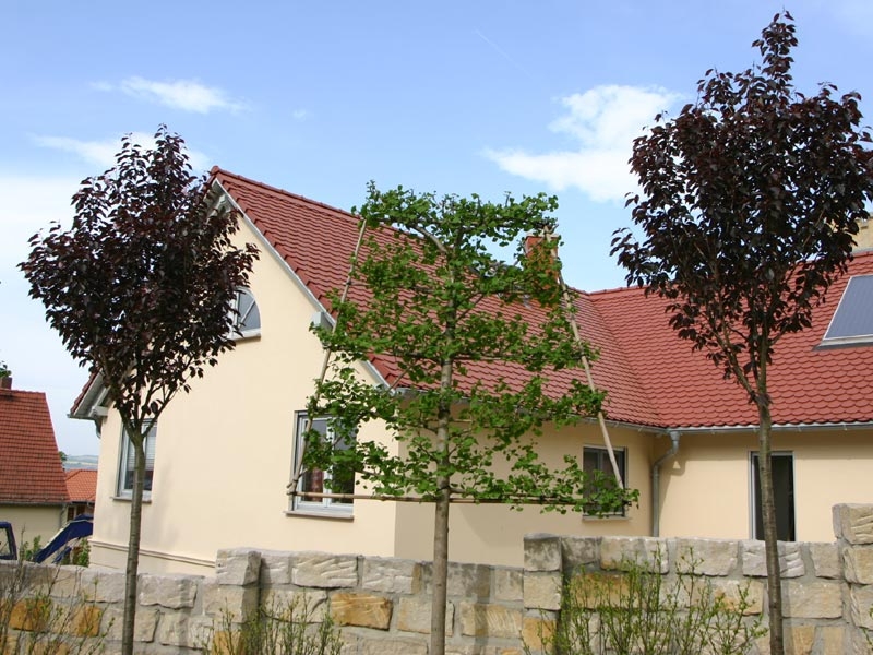 Einen ganz besonderen Sichtschutz bietet diese wunderschöne Kombination mit der rotblättrigen Nelkenkirsche Prunus serrulata `Royal Burgundy`mit dem trapezförmig geschnittenen Hochstamm aus Ginkgo biloba.