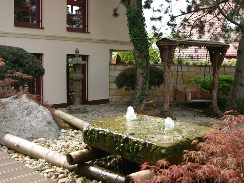 Das Wasserspiel im Eingangsbereich, der asiatisch gestaltet wurde, gibt Kraft und Energie, es ist umrahmt von japanischen Ahörnern.