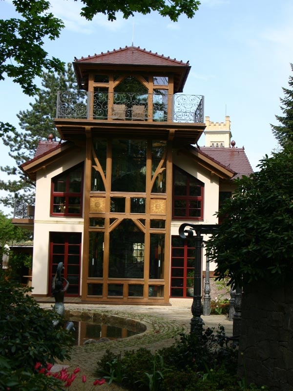 Links im Bild – die Orangerie, die als Anbau an ein bestehendes Haus errichtet wurde und nunmehr einen sehr schönen Platz zum Überwintern der Kübelpflanzen bildet.