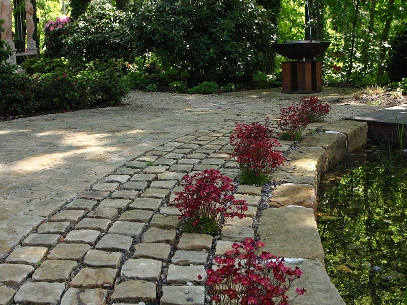 Mit sehr viel Liebe fürs Detail wurde die Bepflanzung rund um den Teich vorgenommen, zur Auflockerung des Sandsteinpflasters
