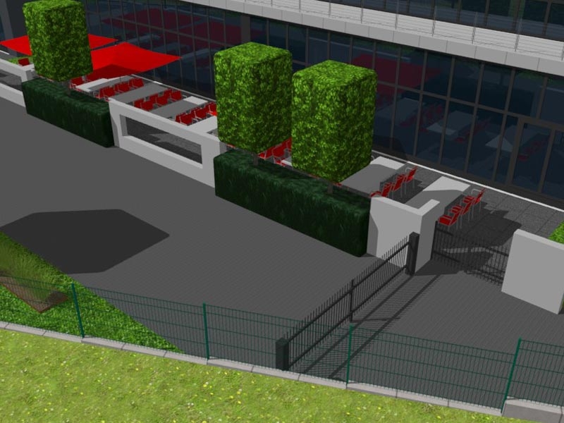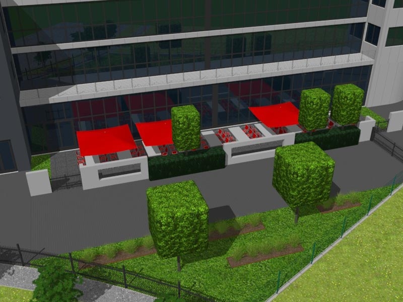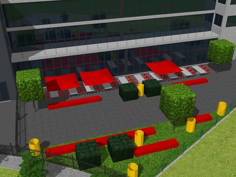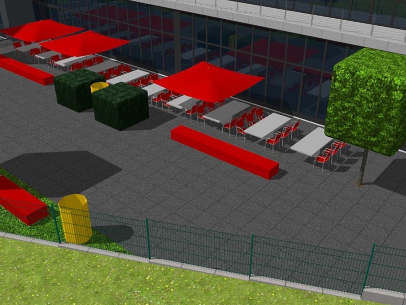 Unser Entwurf fand spontan großen Zuspruch. Passend zum gesamten Corporate Identity des Unternehmens wird der Terrassenbereich sehr modern und gradlinig gestaltet. Die Farben des Ardenne Logos werden von den kräftig roten quadratischen Sonnenschirmen aufgenommen, die Pflanzung wird im Einklang zu den bereits begrünten Bereichen der übrigen Firmengrundstücke in derselben Straße erfolgen.