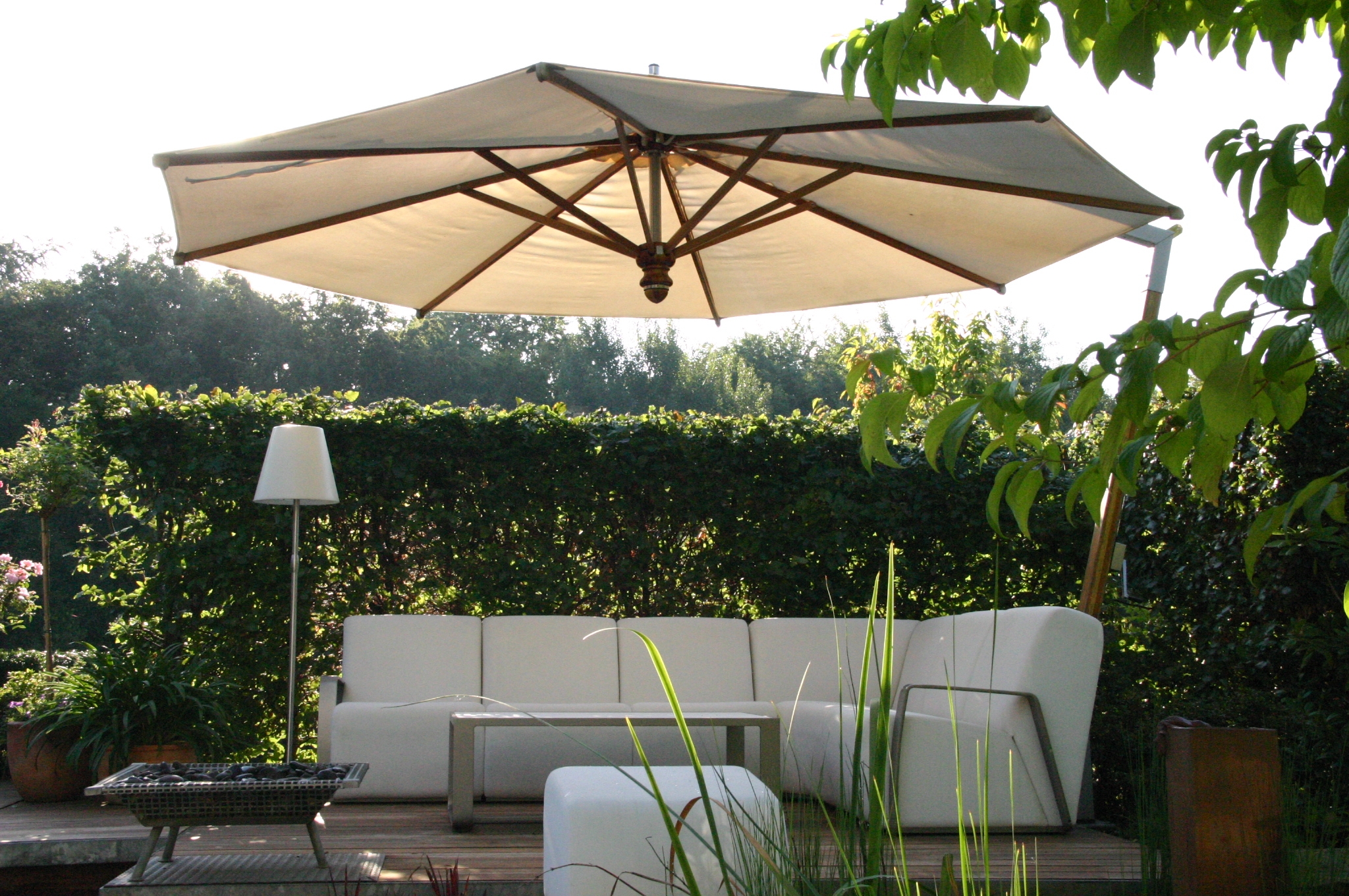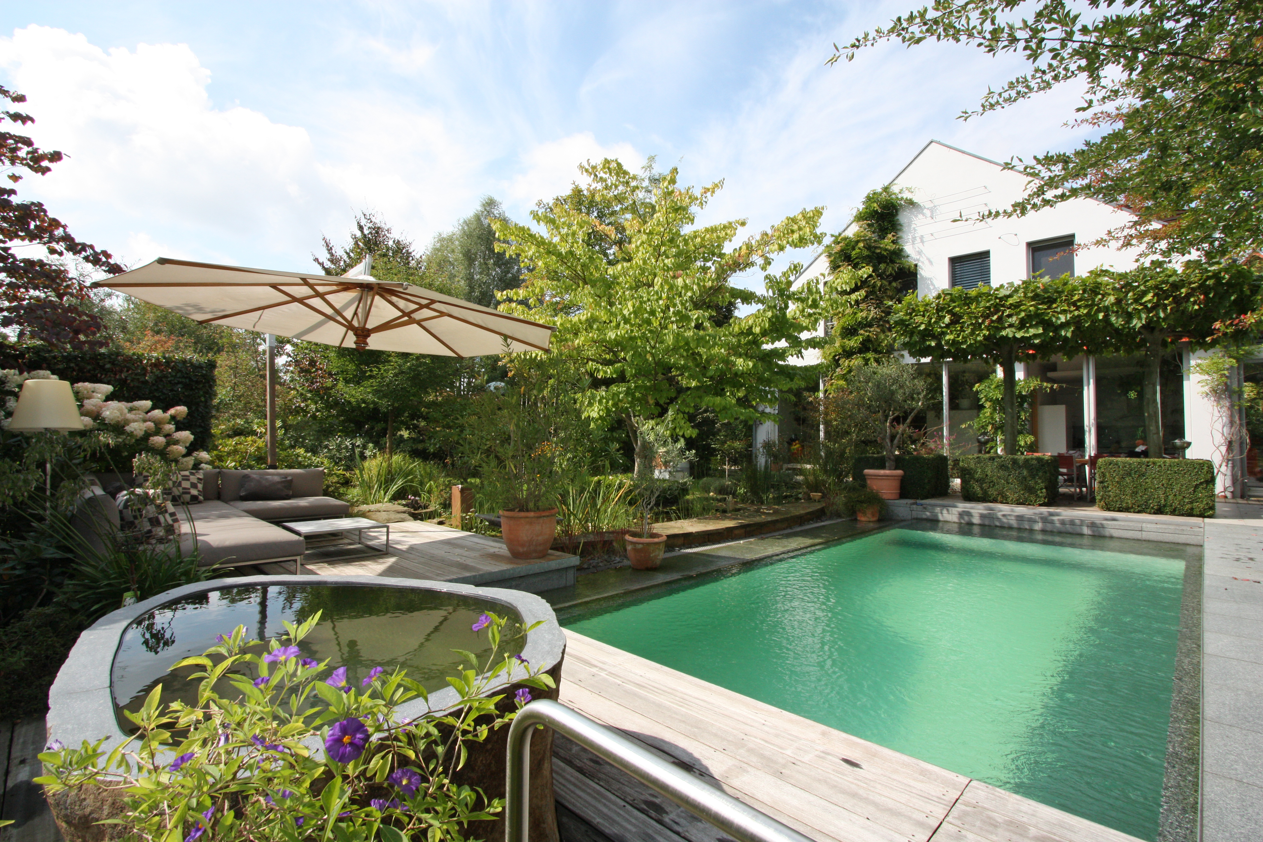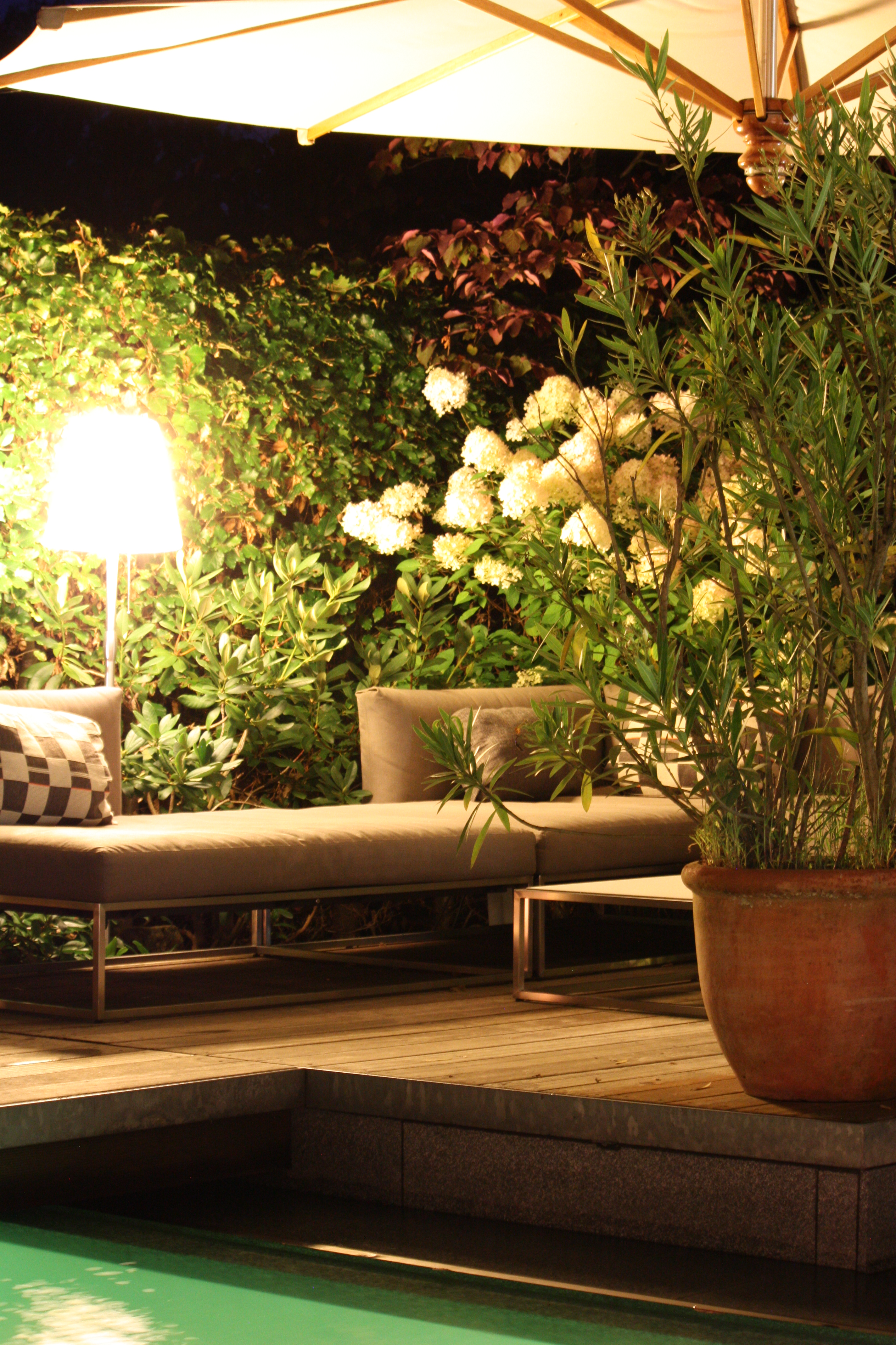 Abends kann man sich schön auf das Gloster Sofa zurück ziehen, um im Schein der Außenstehlampe zu lesen, mit einander zu reden oder einfach nur in den Garten zu schauen, es gibt fast nichts Schöneres. Alles zu bestellen bei uns im Shop. Auf der Liegeterrasse nahe beim Pool entstand ein grünes Wohnzimmer, die Gloster Lounge Garnitur „Club“ ist hier im Einsatz. Gern schicken wir Ihnen einen Katalog der Gloster Möbel zu.