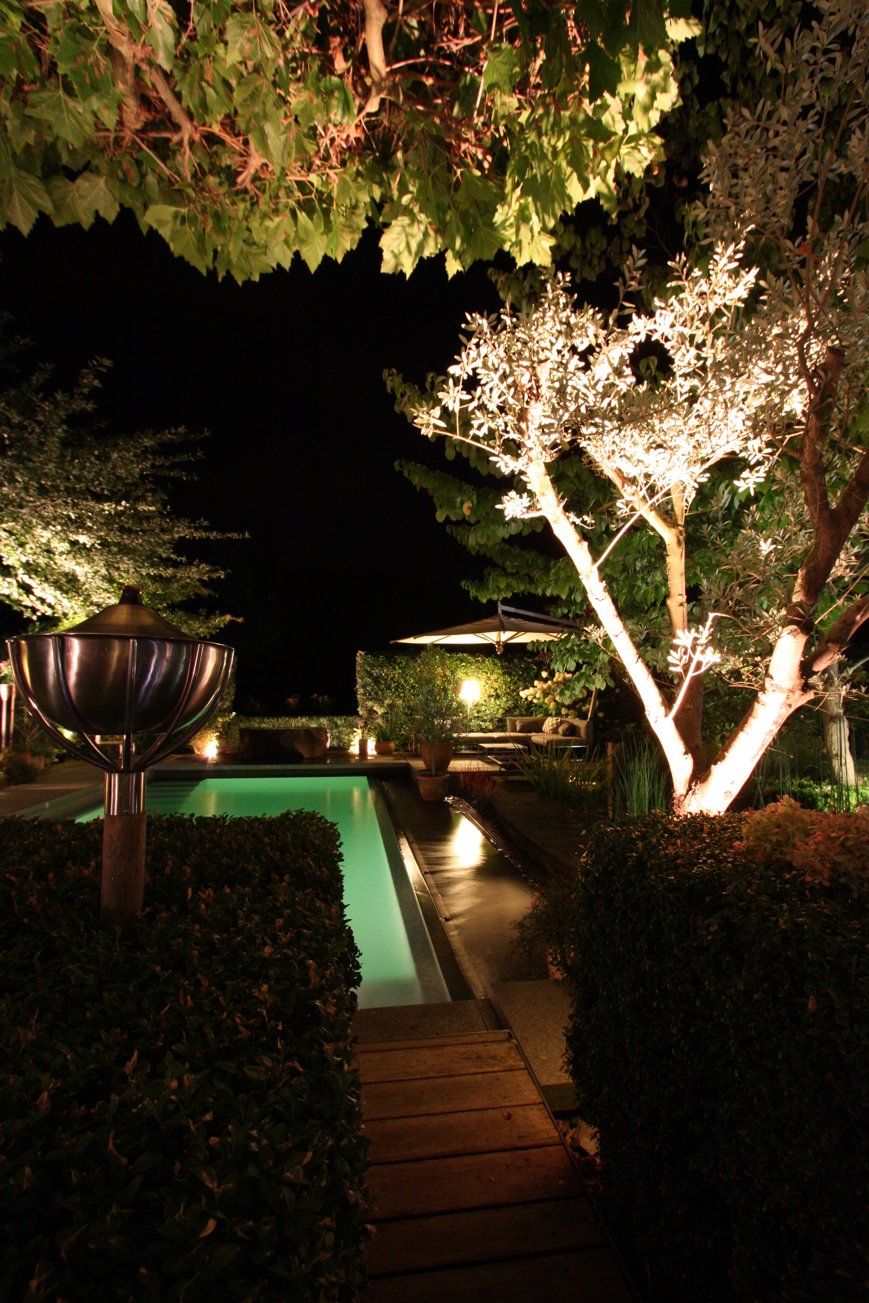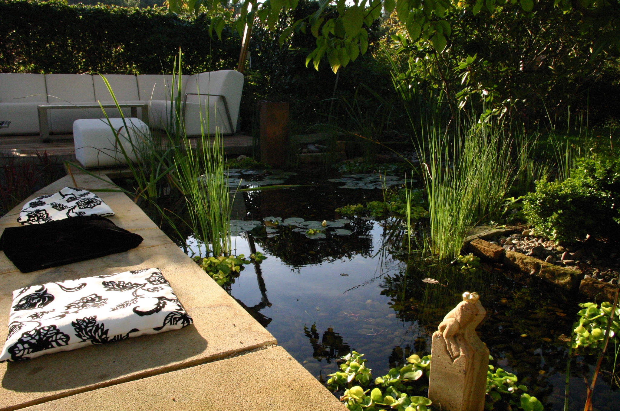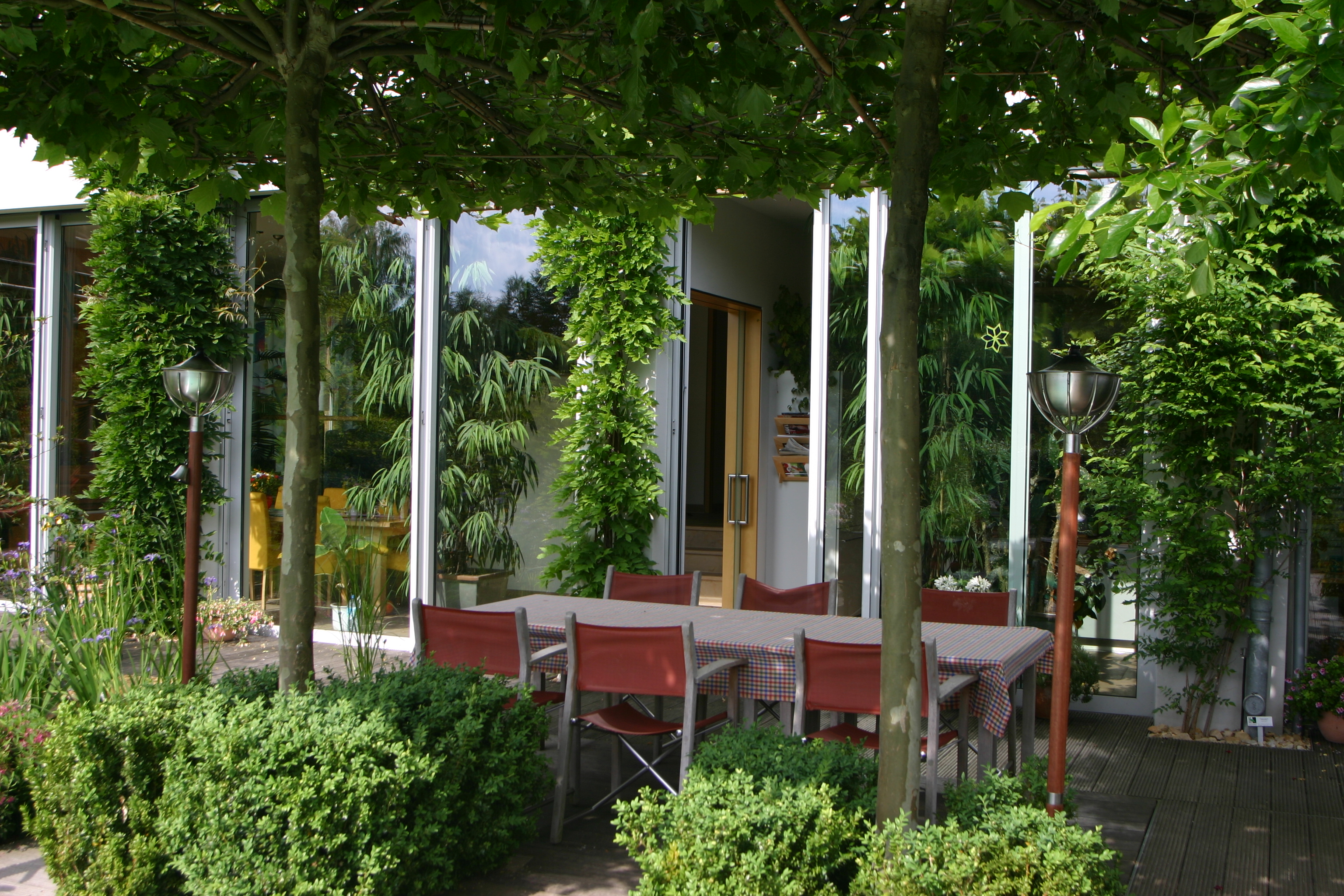 Abends kann man sich schön auf das Gloster Sofa zurück ziehen, um im Schein der Außenstehlampe zu lesen, mit einander zu reden oder einfach nur in den Garten zu schauen, es gibt fast nichts Schöneres. Alles zu bestellen bei uns im Shop. Auf der Liegeterrasse nahe beim Pool entstand ein grünes Wohnzimmer, die Gloster Lounge Garnitur „Club“ ist hier im Einsatz. Gern schicken wir Ihnen einen Katalog der Gloster Möbel zu.