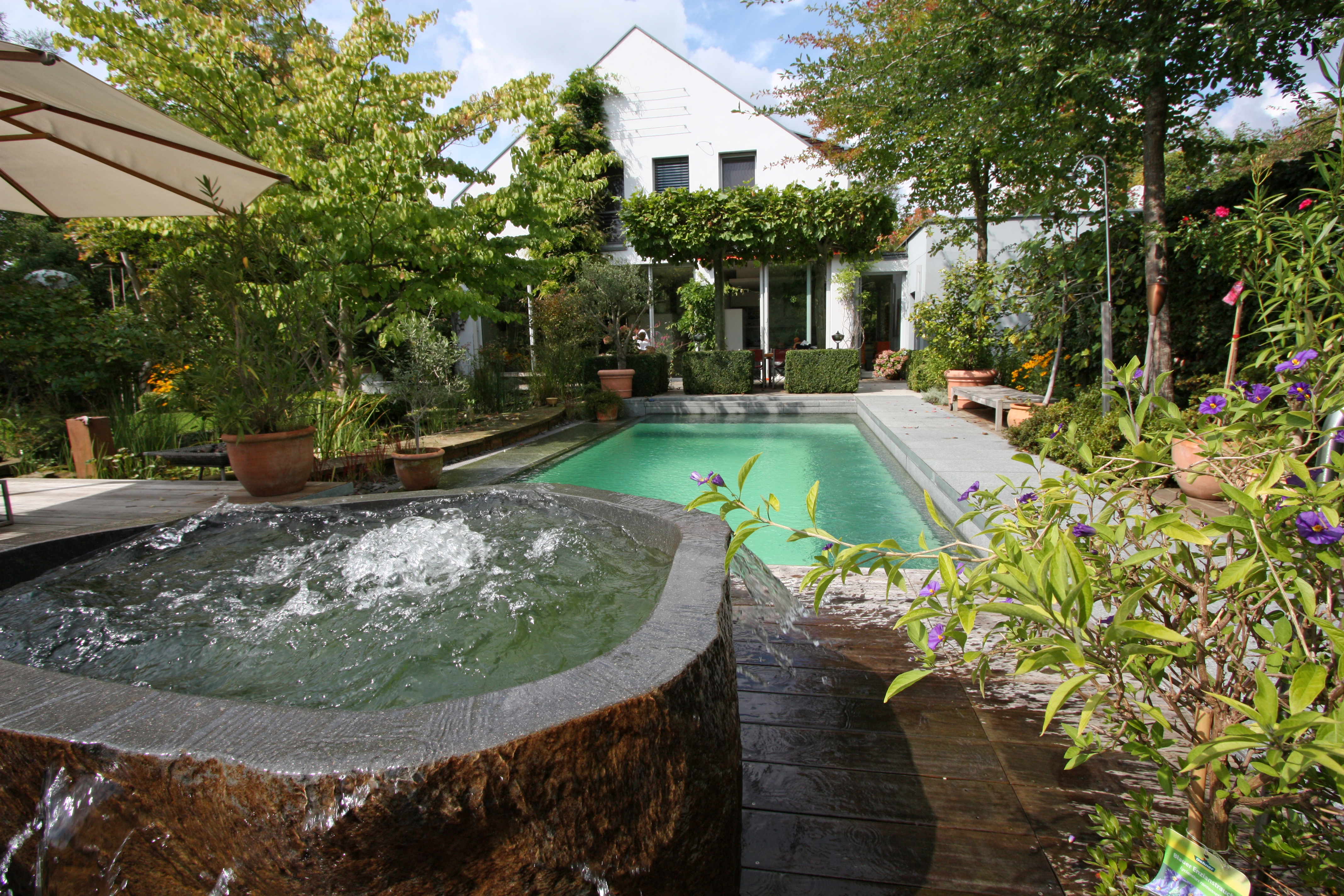 In der Badewanne aus einem Kieselstein kann man wirklich baden! Das Wasser der Badewanne wird hierfür mit einem Wärmetauscher erhitzt. Alternativ kann man die Kieselsteinwanne auch nur als Augenweide nutzen und lässt das Wasser über ihren Rand hinüber laufen. Unterirdisch läuft dann das Wasser wieder zurück in den Pool.