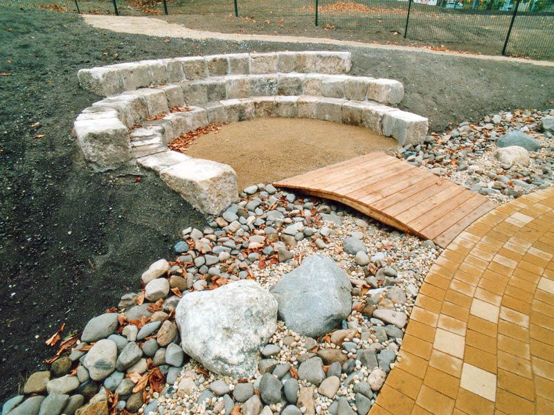 Theater- und Andachtsrunde aus Sandsteinquadern, radial zugeschnitten. Anbindung an die Wege durch eine Brücke aus Robinienholz mit Lärchenbrettern, die sich über eine gestaltete und offene Rigole spannt.
