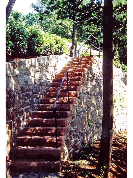 Treppenabgang an einer Weinbergsmauer aus tschechischem Sandstein. Als Abpflanzung und somit Absturzsicherung wurden Kirschlorbeer in einer Höhe von 1,50 m gepflanzt.
