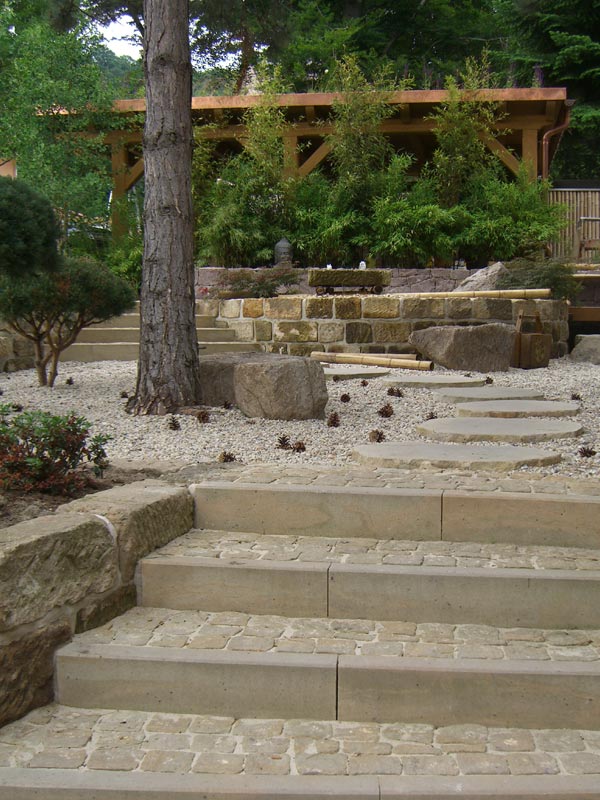 Die Sandsteintreppe mit Sandsteinpflaster führt in den asiatischen Gartenteil, der sich unter hohen, alten Kiefern befindet.