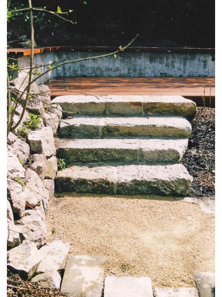 Stufenanlage aus gebrauchtem Sandstein. Die alten Sandsteinplatten wurden höhen- und gestaltungsgerecht geschnitten und wieder eingebaut.