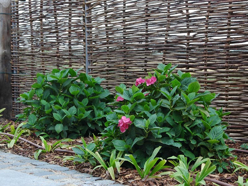 Die Haselnusszäune sind im Gartenbereich abgepflanzt. Das Grün der Hortensie mit dem anschließenden Carex als Bodendecker betont die natürliche Gestaltung.