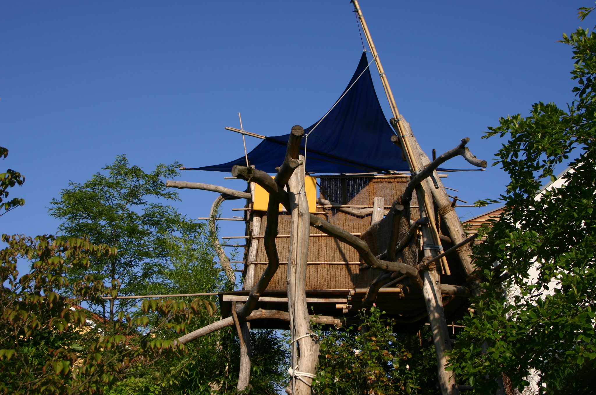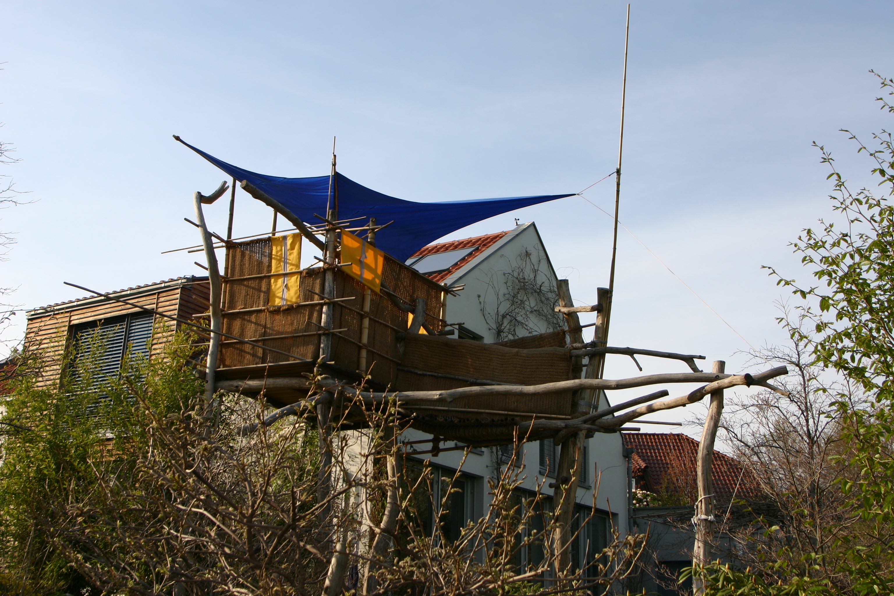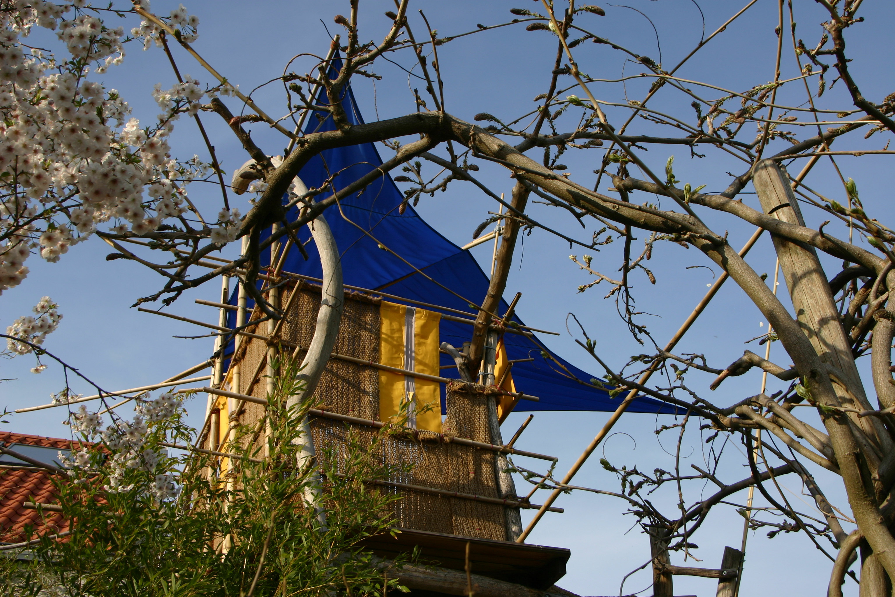 Die Form des Hauses ähnelt einem Schiff, weshalb auch als Sonnenschutz oberhalb der Baumhauses ein Segel gehisst wurde.