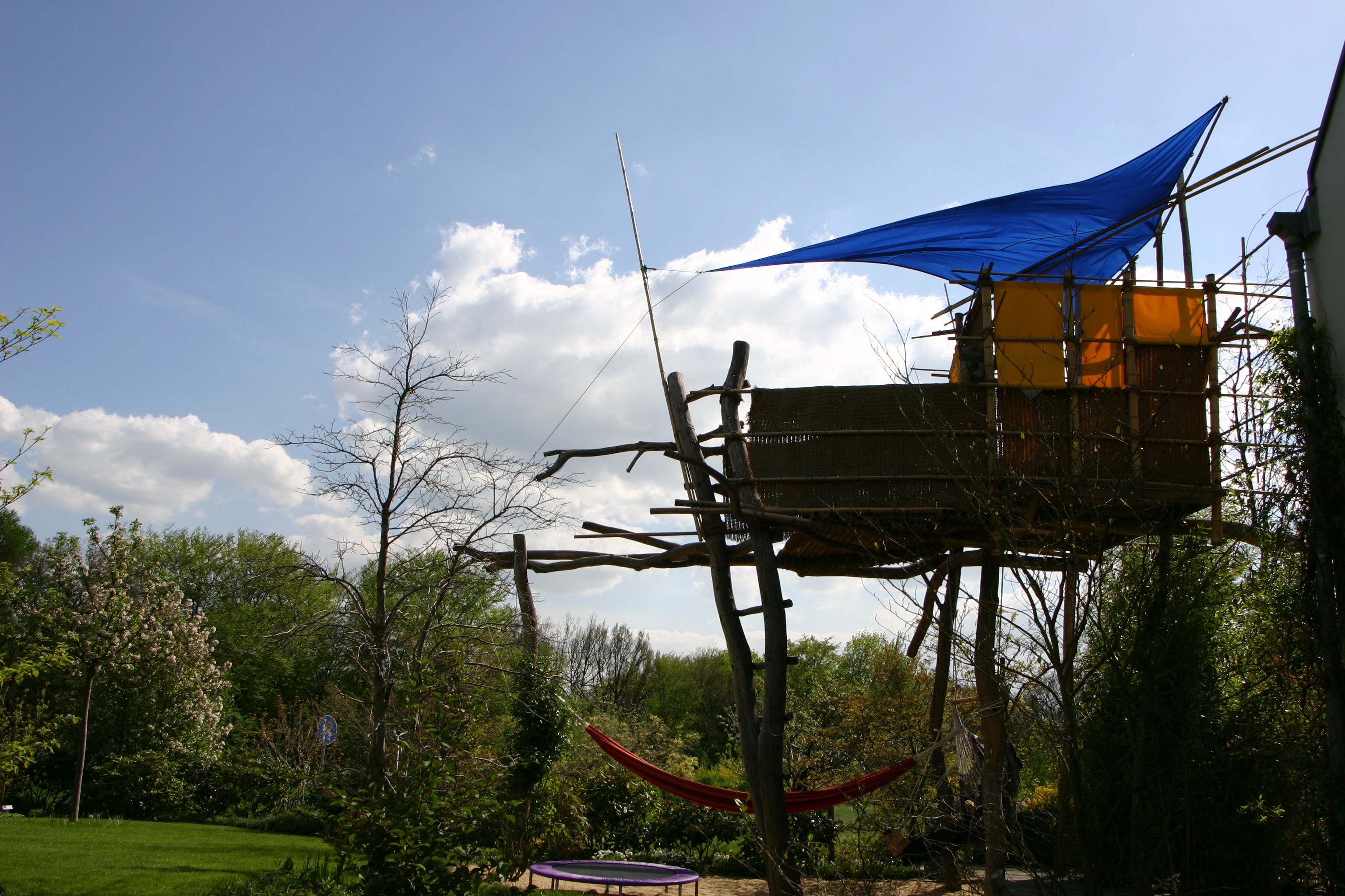 Durch die Höhe des Baumhauses ist die Nutzung der Fläche unterhalb nicht eingeschränkt. Man kann problemlos unter dem Baumhaus hergehen und diesen Raum nutzen.Robinson Cruso wäre hier auch gern eingezogen. Das Baumhaus ist ein einziges Abenteuer. Manchmal tummeln sich fast alle Kinder der Nachbarschaft hier. Das Baumhaus ist auch gleichzeitig eine Art Hochsitz. Von hier aus hat man einen faszinierenden Rundblick auf den Garten und dem anschließenden Wald. Mit etwas Geduld kann man die Wildschweine und Rehe auf der Wiese vor dem Wald beobachten.