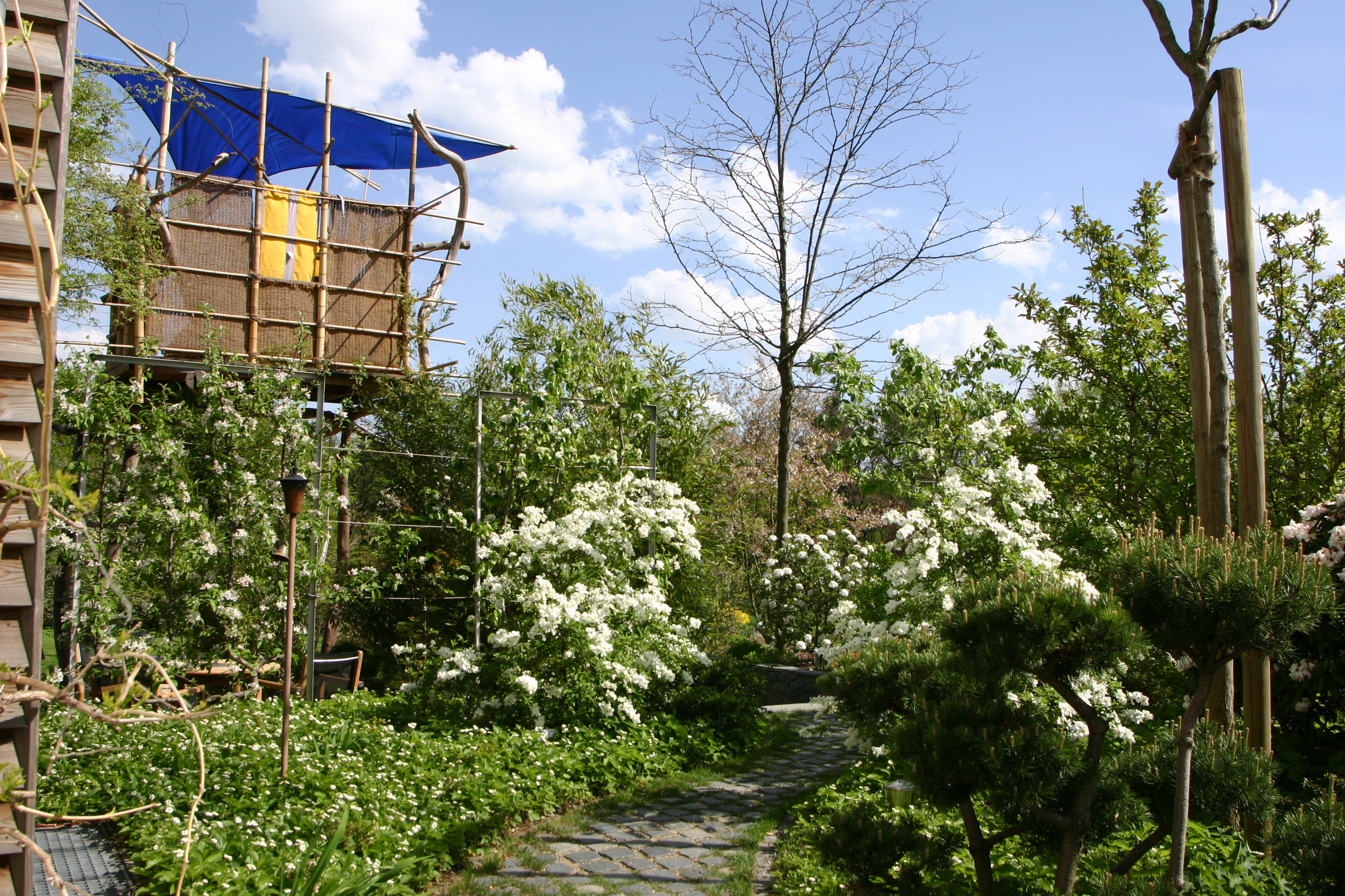 Das Baumhaus wurde ebenfalls nach eigenem Entwurf gestaltet. Mit großer Kreativität entstand aus natürlichen Robinienstämme ein Baumhaus, dass es so kein zweites Mal gibt. Der Wuchs der Robinie bestimmte die Form. Durch die Verarbeitung der Bambusstämme wurde wieder Bezug zu dem lebenden Bambus unterhalb des Baumhauses geschaffen. Die Grundfläche des Baumhauses ist so groß, dass bequem 2-3 Kinder oder aber auch 2 Erwachsene hier in luftiger Höhe von ca. 3 m übernachten können. Ein ganz besonderes Erlebnis.