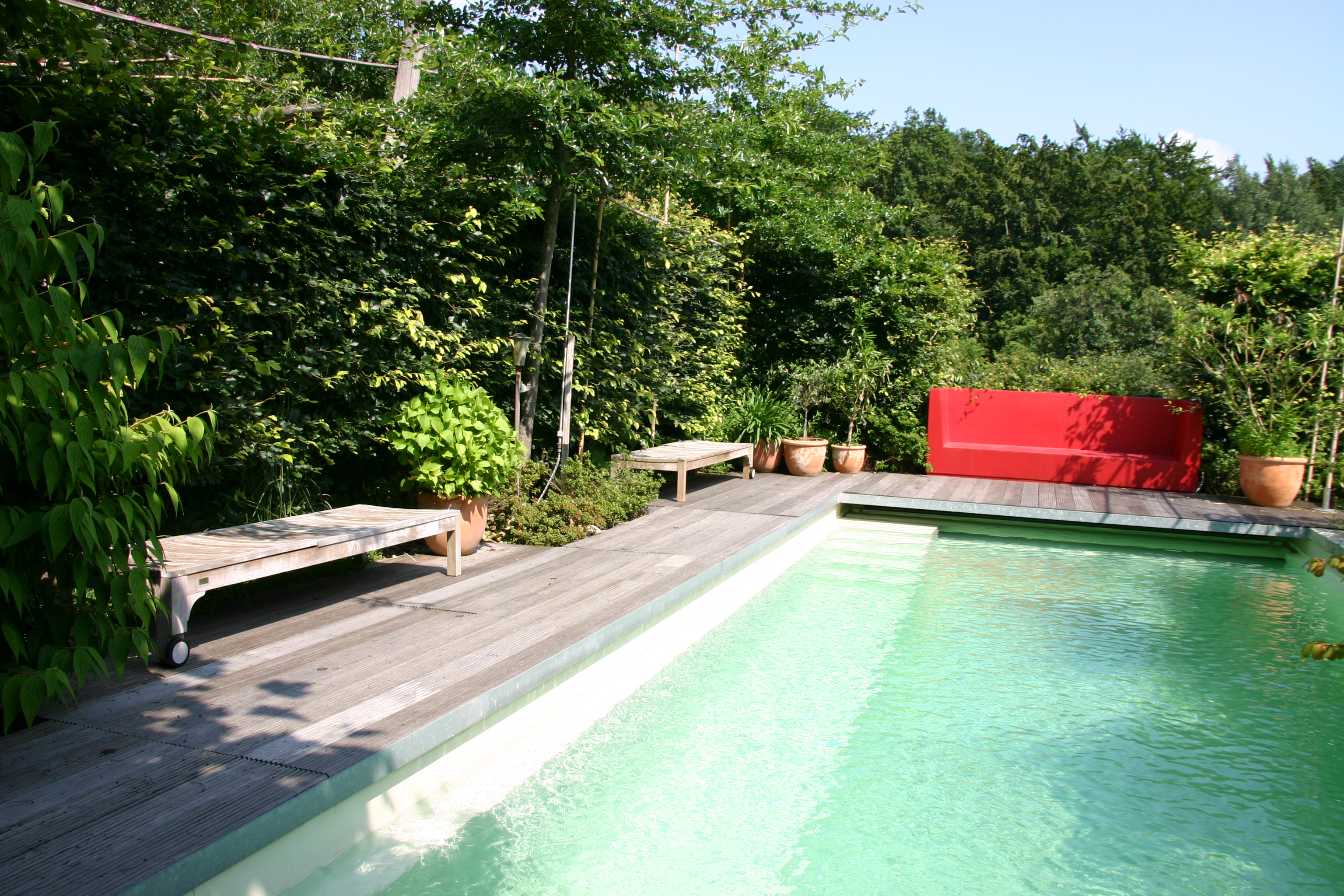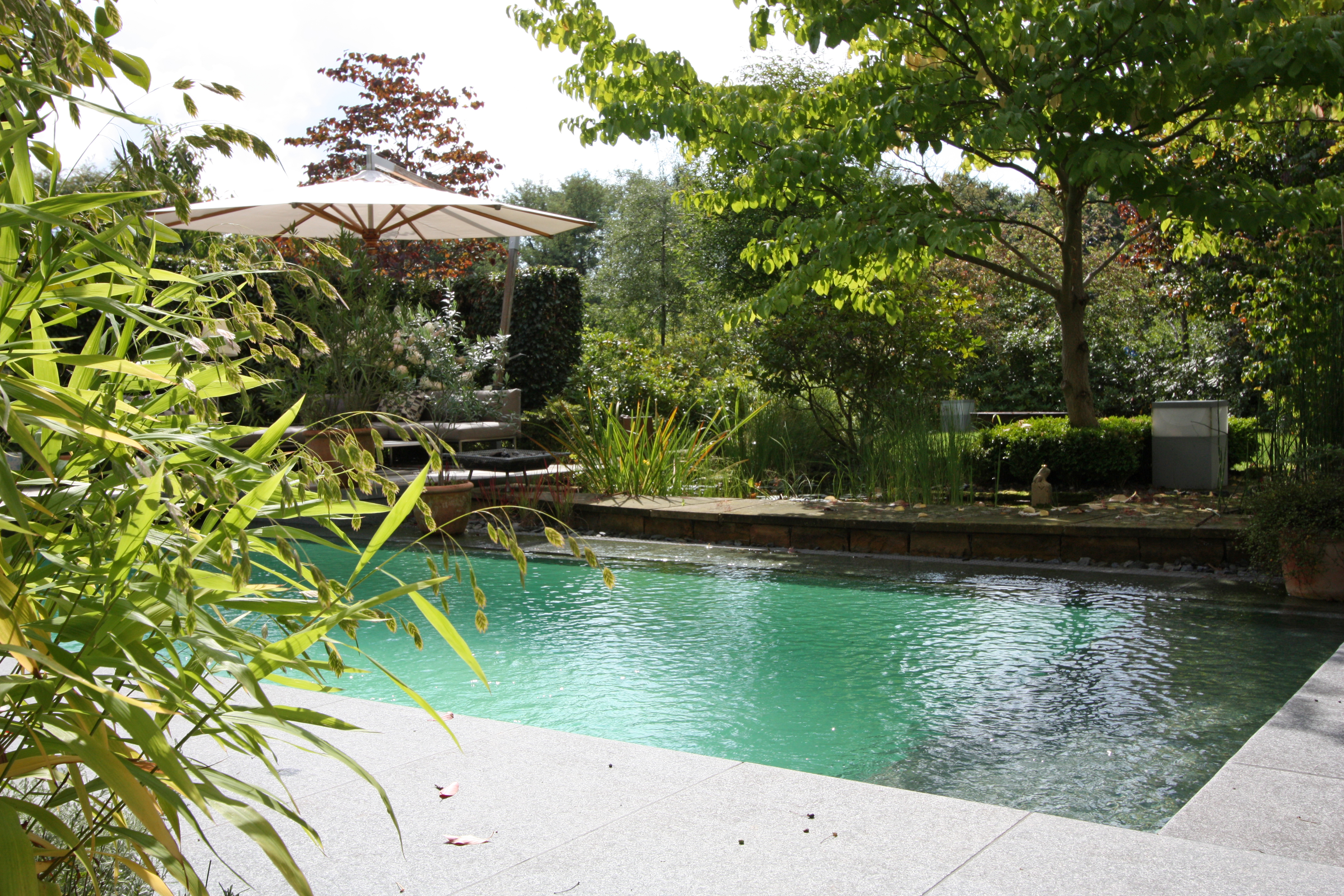 Der Schwimmzone des Schwimmteiches wird umrahmt von einem Holzsteg aus Bankirai, der übergeht in großzügige Holzterrassen aus demselben Material.Der Sitzplatz am Pool wird beschattet vom Sonnenschirm Pendulum der Marke Fischer Möbel.Glasklares Wasser ohne Chemie! Der Traum eines jeden Schwimmbadbesitzers. Wir realisieren Ihnen diesen Traum. Tauchen Sie ein, in dieses klare, saubere Wasser und genießen Sie die Topqualität, die Ihnen kein herkömmliches Schwimmbad bieten kann.Von der Terrasse und vom Haus hat man einen unverbauten Blick auf den Schwimmteich. Die Regenerationszone und Schwimmzone bilden eine optische Einheit. Auf harmonische Weise werden die bauliche Architektur mit den natürlichen Strukturen umliegender Bereiche verbunden.