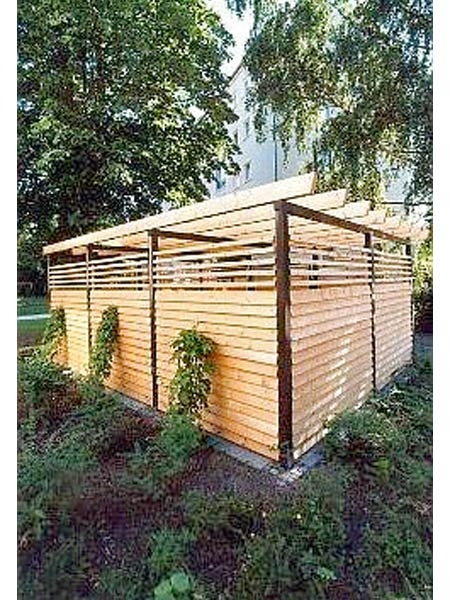 Diese Müllanlage wurde mit Lärchenholz in Stülpschalung verkleidet. Das Holz ist durch seinen hohen Harzanteil sehr widerstandsfähig und kann deshalb natur belassen eingebaut werden.