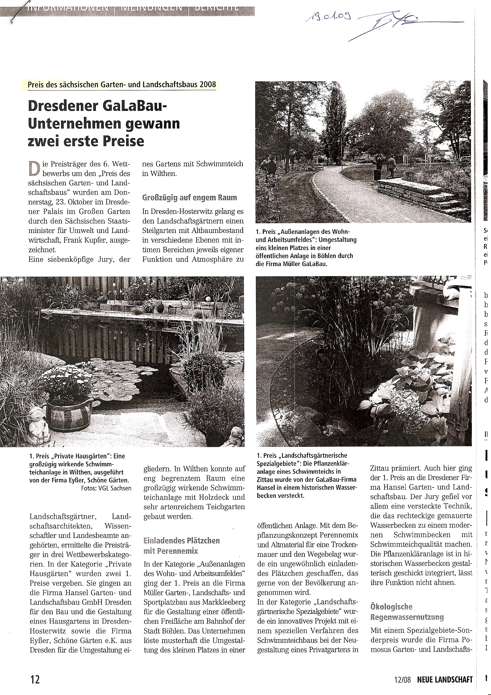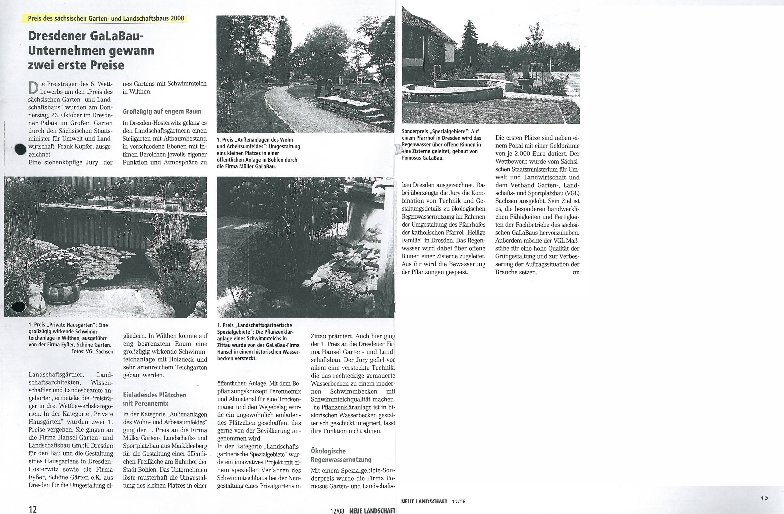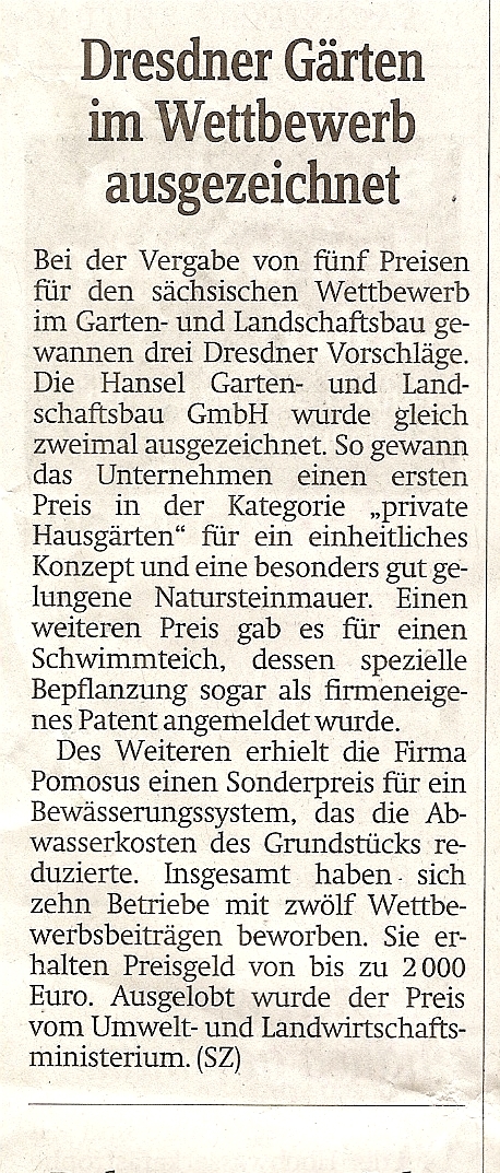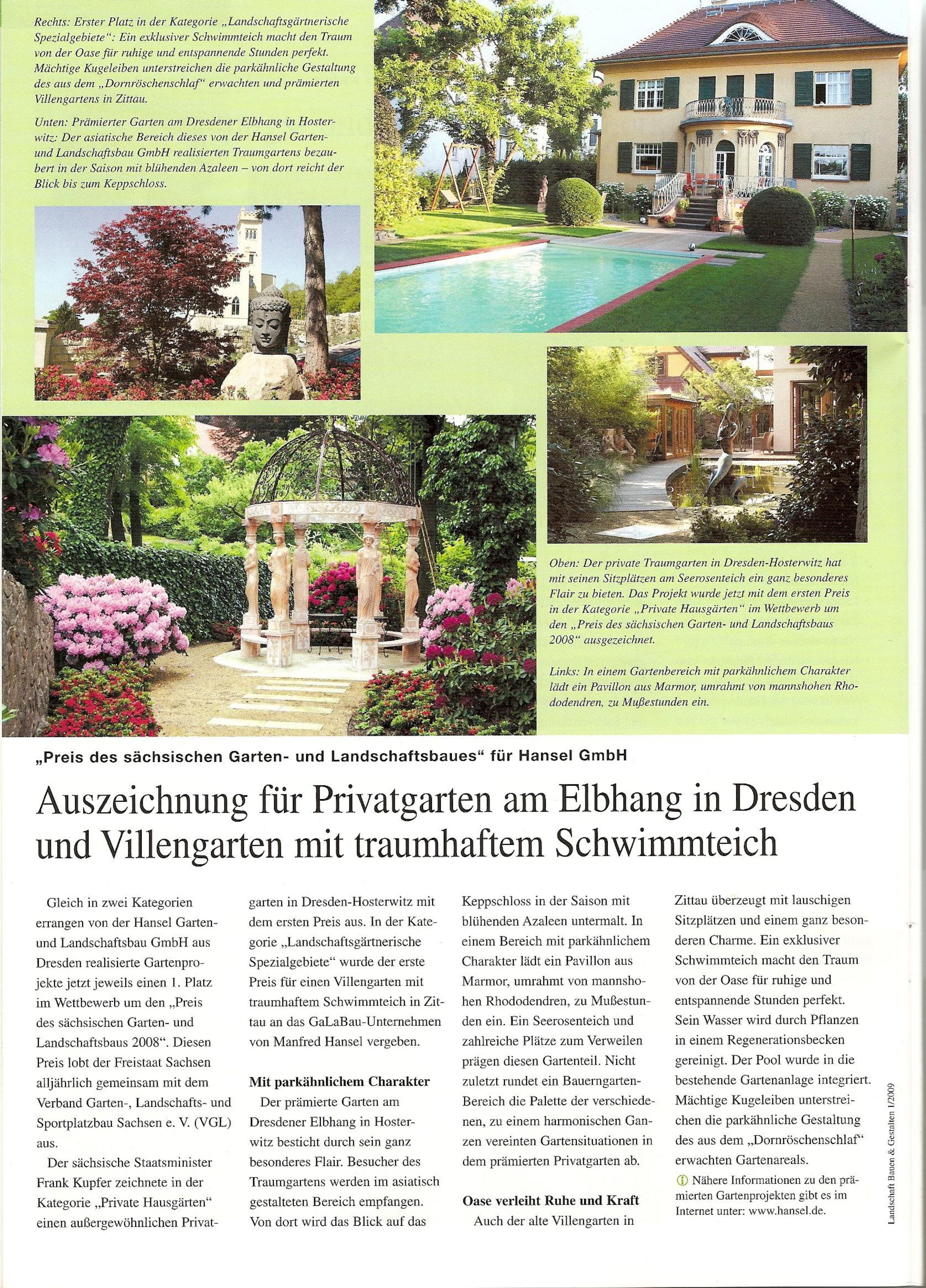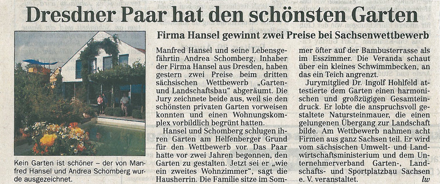 Presse Ruhe auf Frieden, Sächsische Zeitung – online, 08.09.2017 Canalettoblick Dresden, 2016 PrivatePool Seite 2 PrivatePool Seite 1 Preis des sächs. Garten- und Landschaftsbaues für Hansel Sonderpreis „Gartensanierung Mehrfamilienhaus“ 2013 1.Preis und Sonderpreis Kategorie „Außenanlagen des Wohn- und Arbeitsumfeldes“, 2016 Neue Landschaft 1208 Seite 1 Neue Landschaft 1208 Seite 2 1.Preis Berichterstattung DNN 24.10.2008 Presse Preis des sächs.GalaBaus TeilenE-MailFacebook