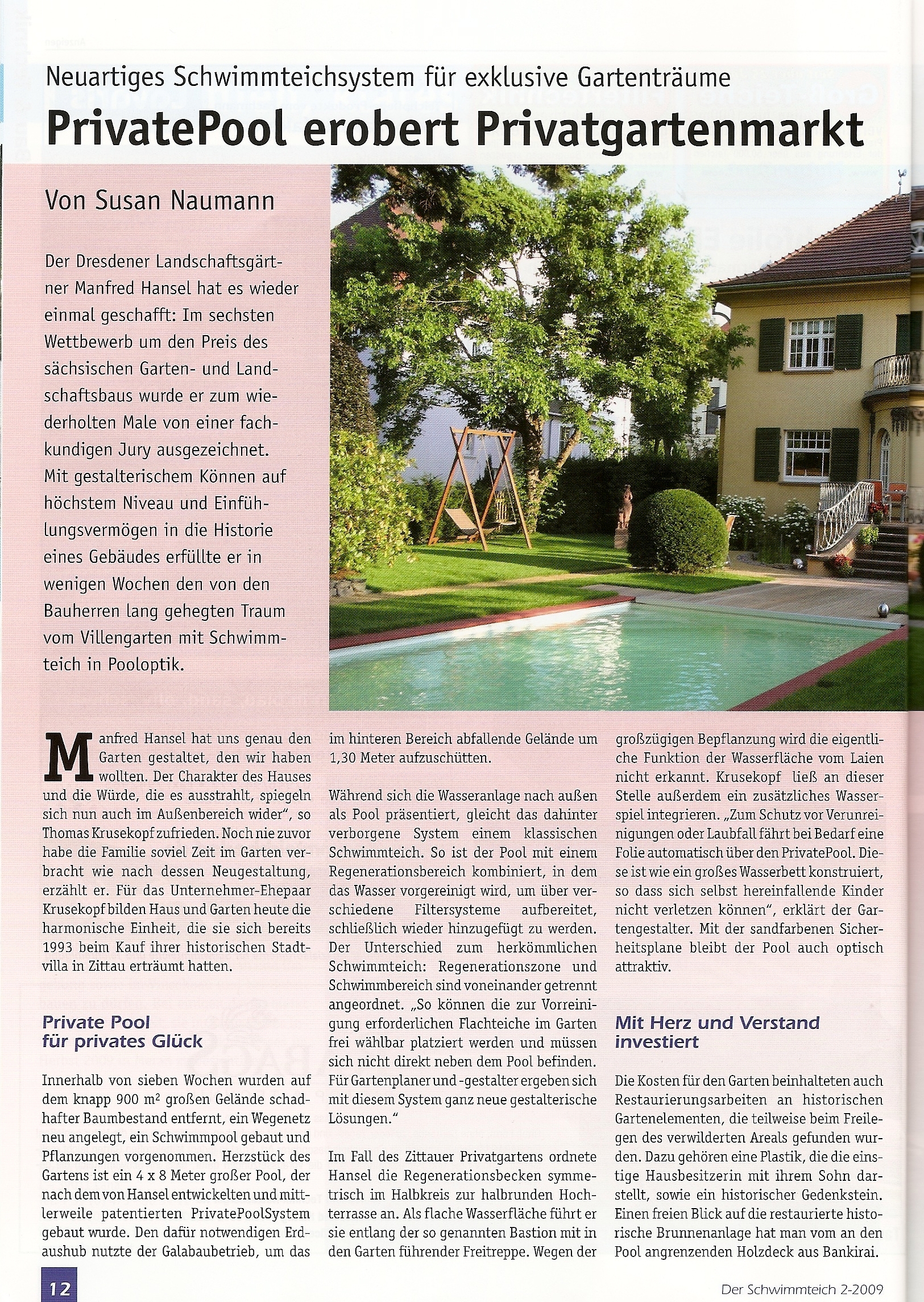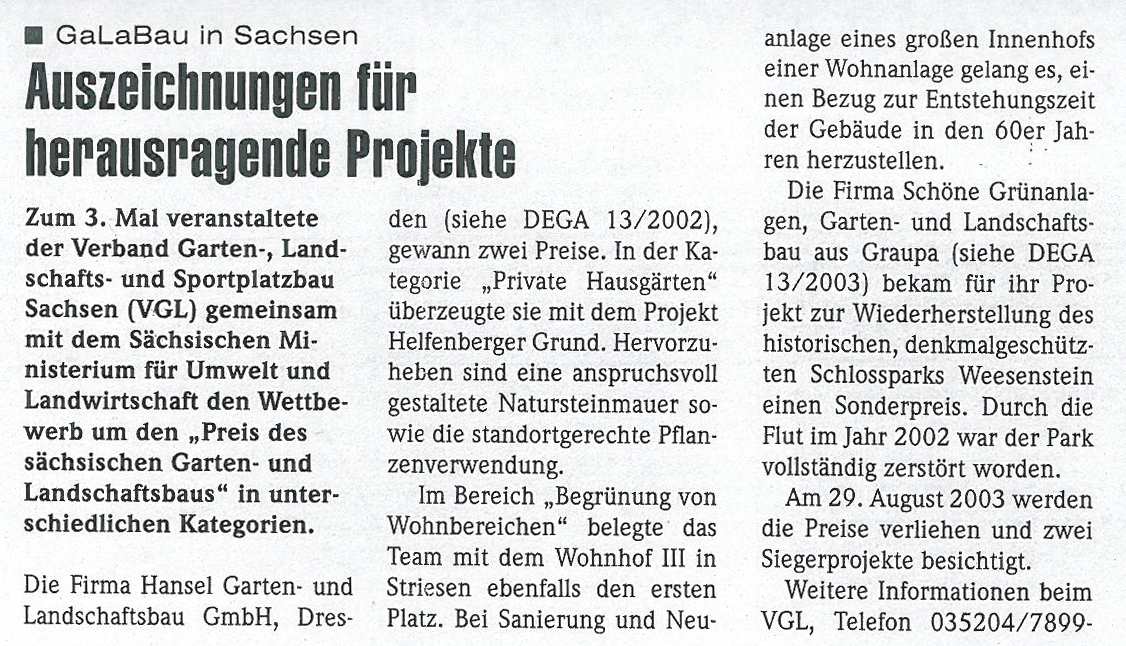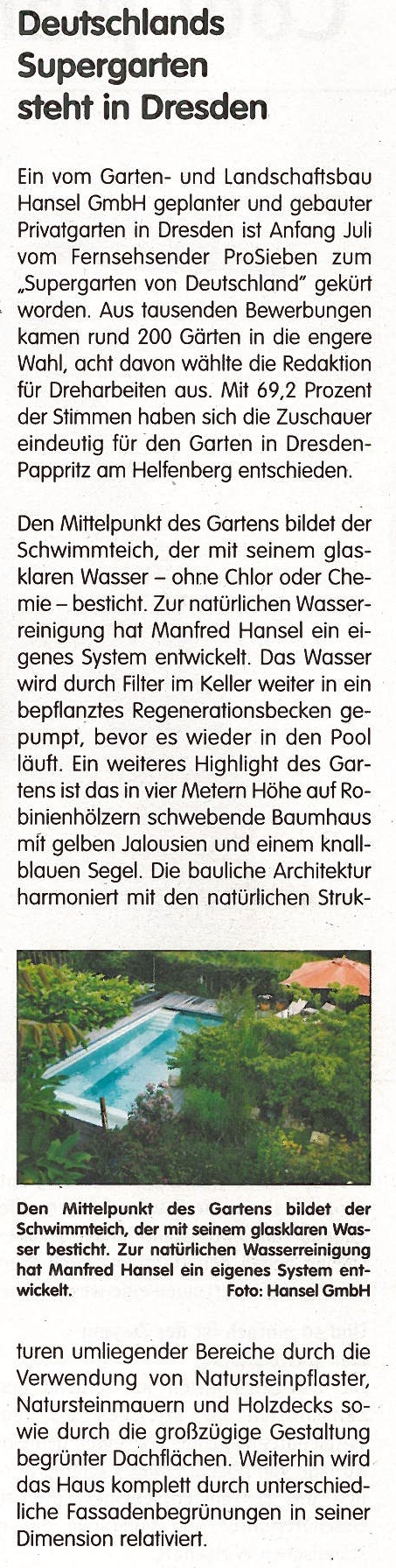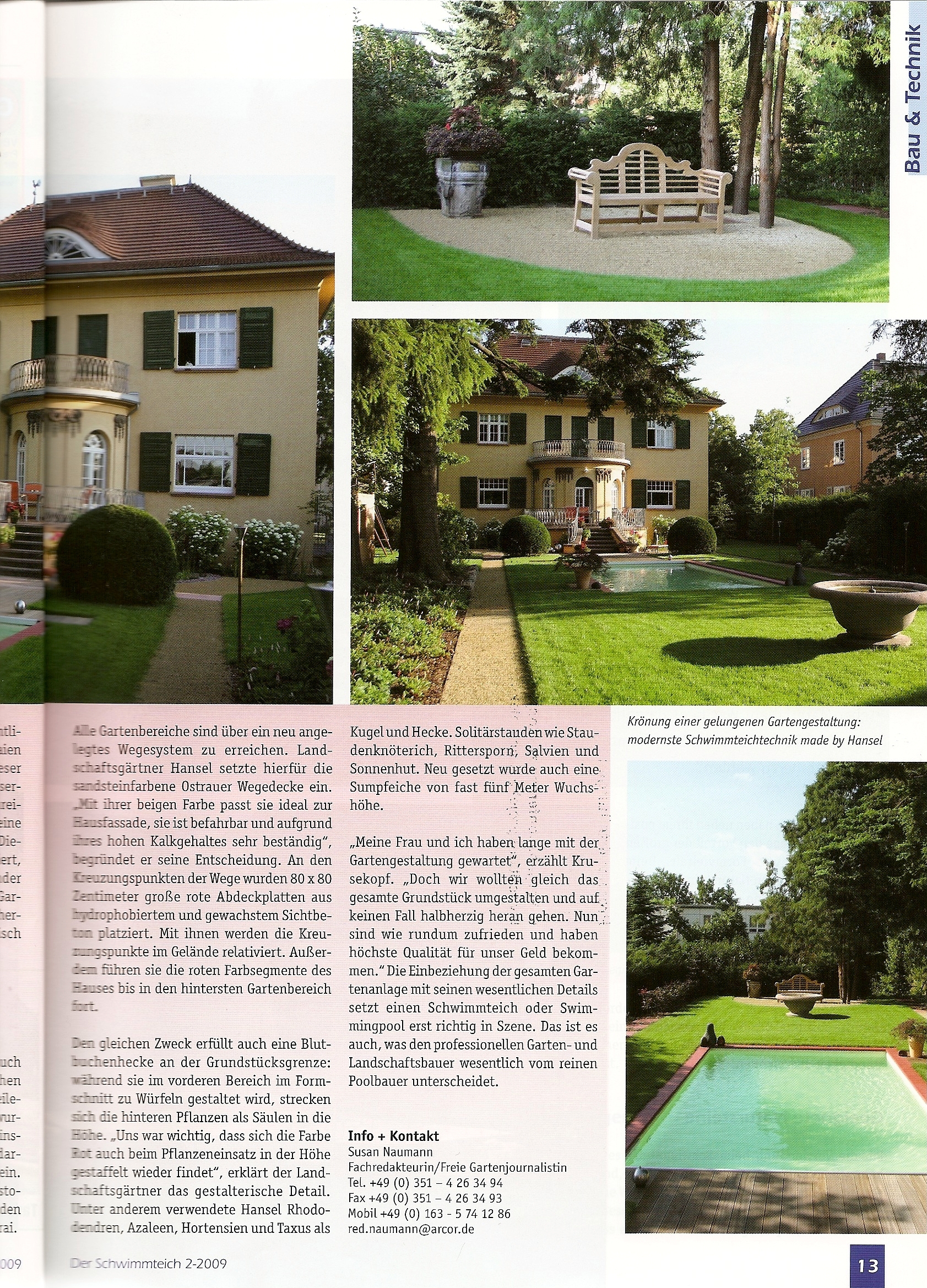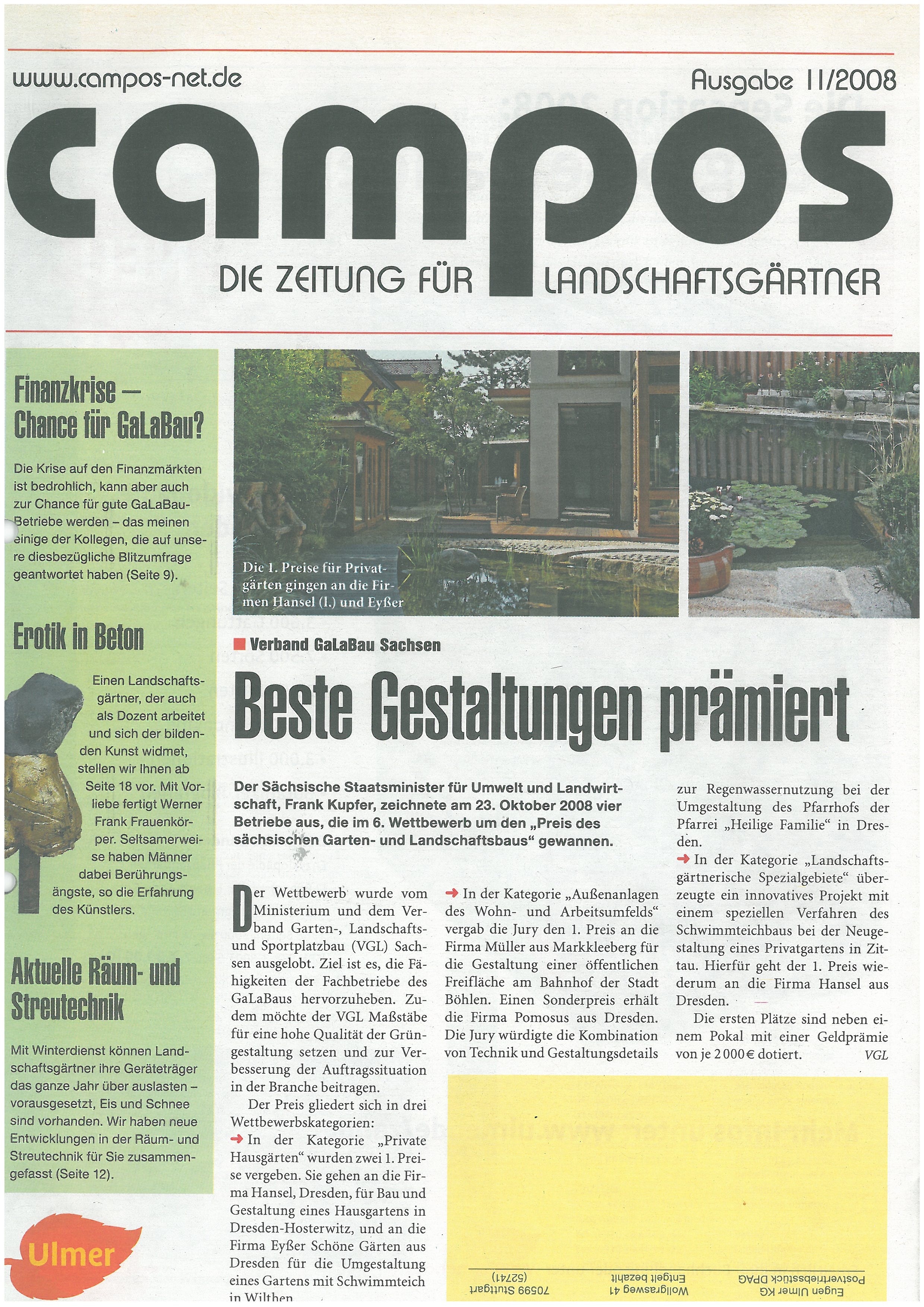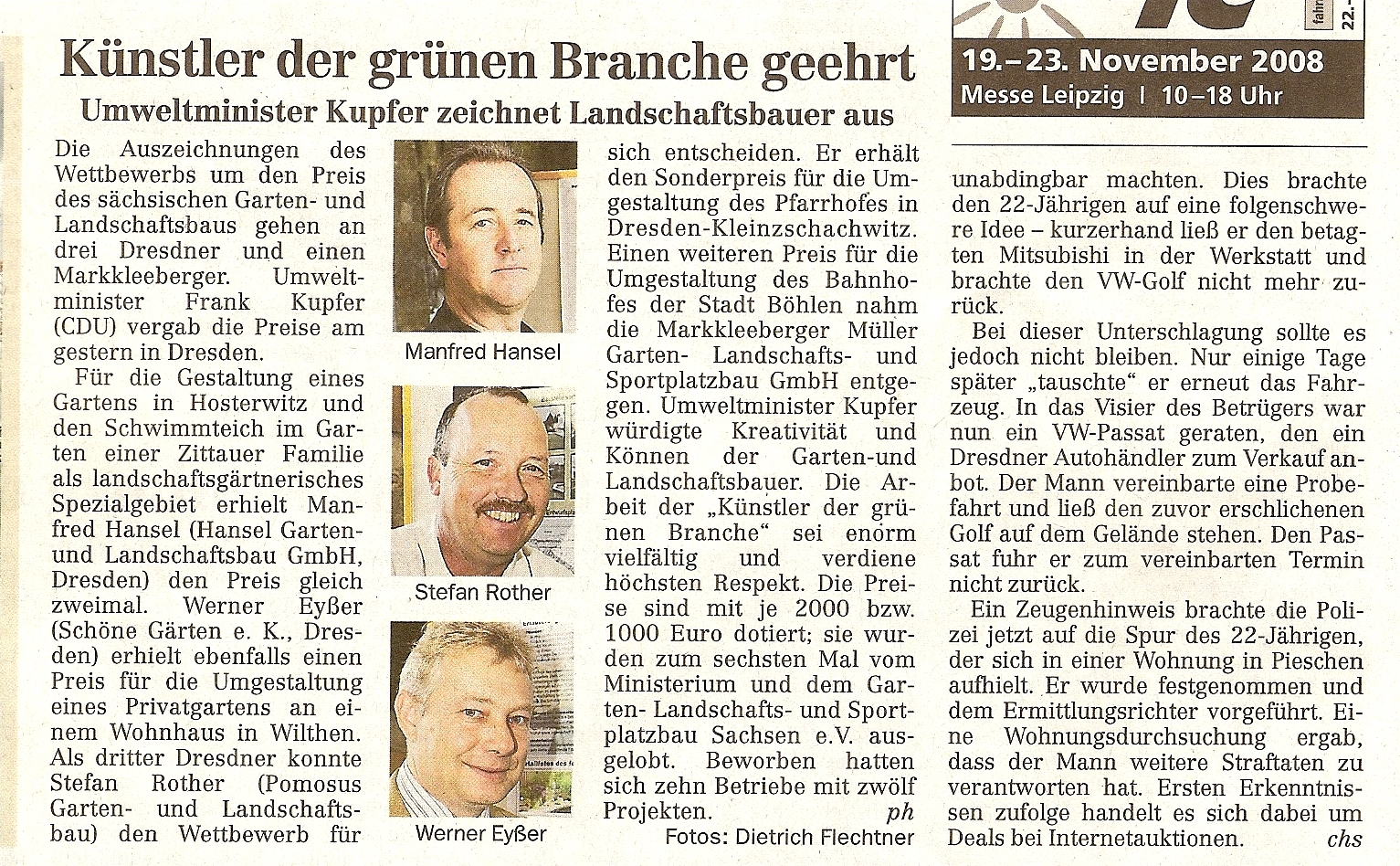 Presse Ruhe auf Frieden, Sächsische Zeitung – online, 08.09.2017 Canalettoblick Dresden, 2016 PrivatePool Seite 2 PrivatePool Seite 1 Preis des sächs. Garten- und Landschaftsbaues für Hansel Sonderpreis „Gartensanierung Mehrfamilienhaus“ 2013 1.Preis und Sonderpreis Kategorie „Außenanlagen des Wohn- und Arbeitsumfeldes“, 2016 Neue Landschaft 1208 Seite 1 Neue Landschaft 1208 Seite 2 1.Preis Berichterstattung DNN 24.10.2008 Presse Preis des sächs.GalaBaus TeilenE-MailFacebook