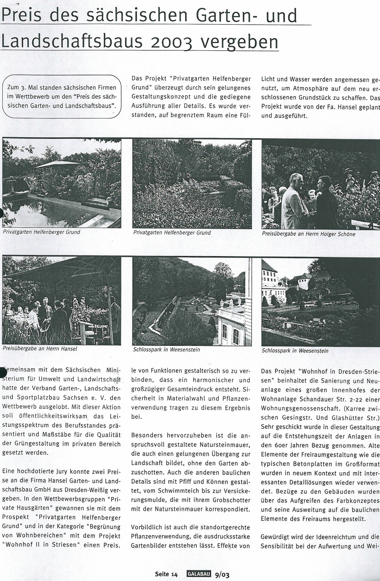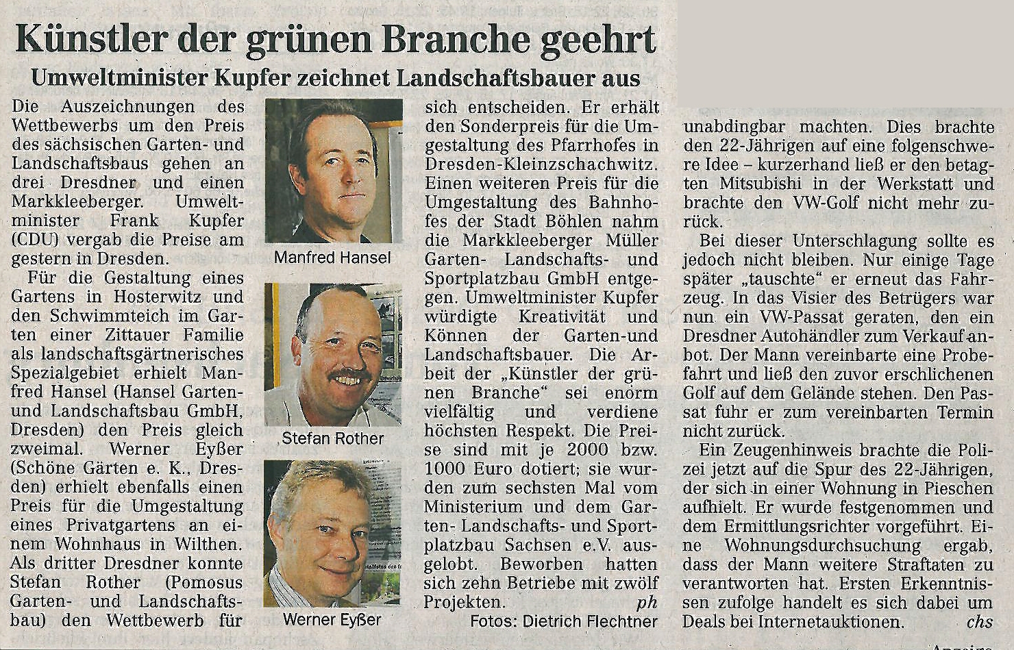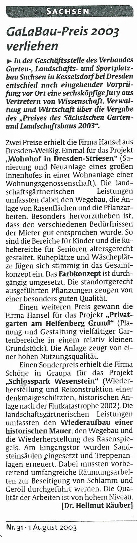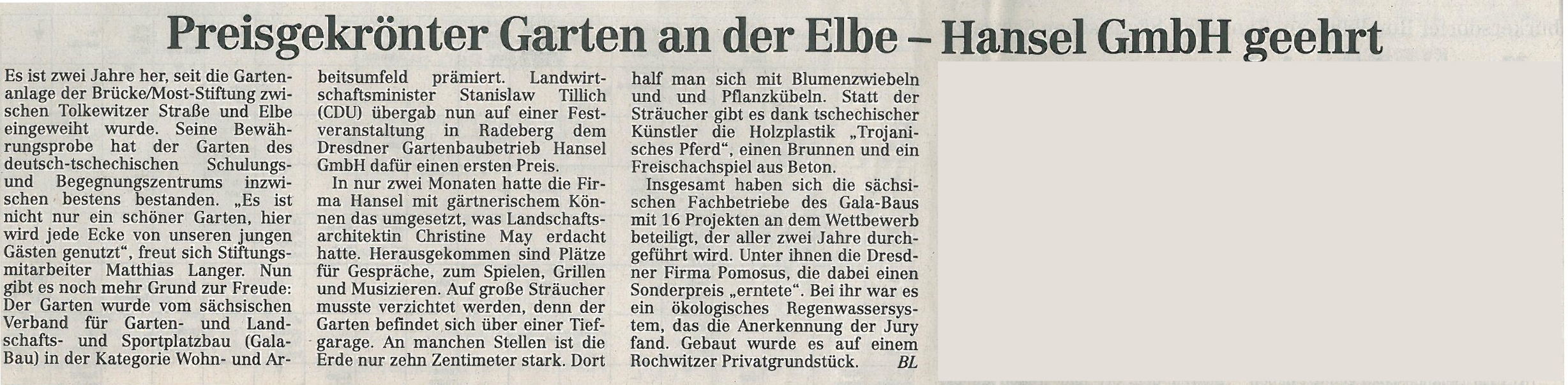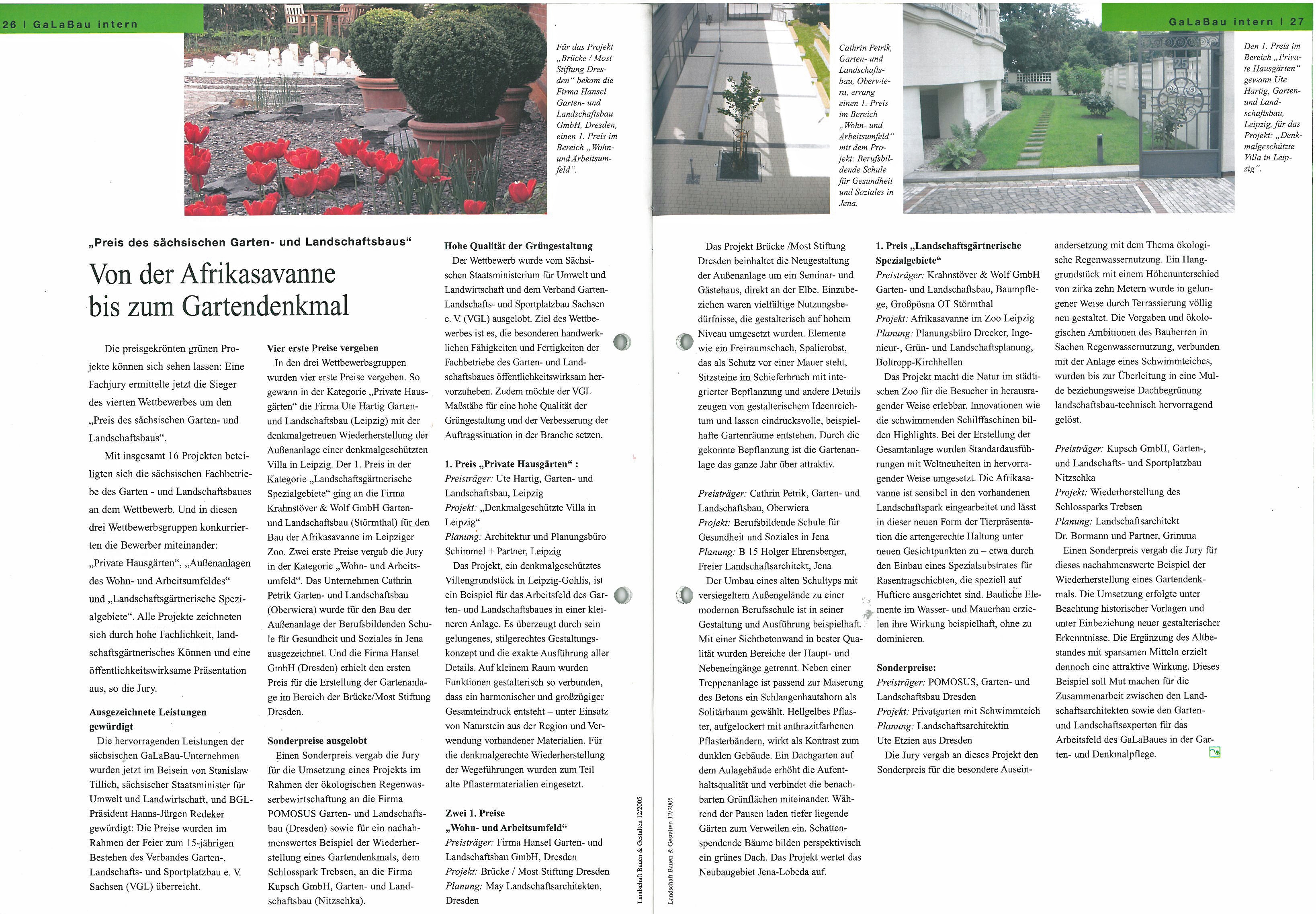 Presse Ruhe auf Frieden, Sächsische Zeitung – online, 08.09.2017 Canalettoblick Dresden, 2016 PrivatePool Seite 2 PrivatePool Seite 1 Preis des sächs. Garten- und Landschaftsbaues für Hansel Sonderpreis „Gartensanierung Mehrfamilienhaus“ 2013 1.Preis und Sonderpreis Kategorie „Außenanlagen des Wohn- und Arbeitsumfeldes“, 2016 Neue Landschaft 1208 Seite 1 Neue Landschaft 1208 Seite 2 1.Preis Berichterstattung DNN 24.10.2008 Presse Preis des sächs.GalaBaus TeilenE-MailFacebook