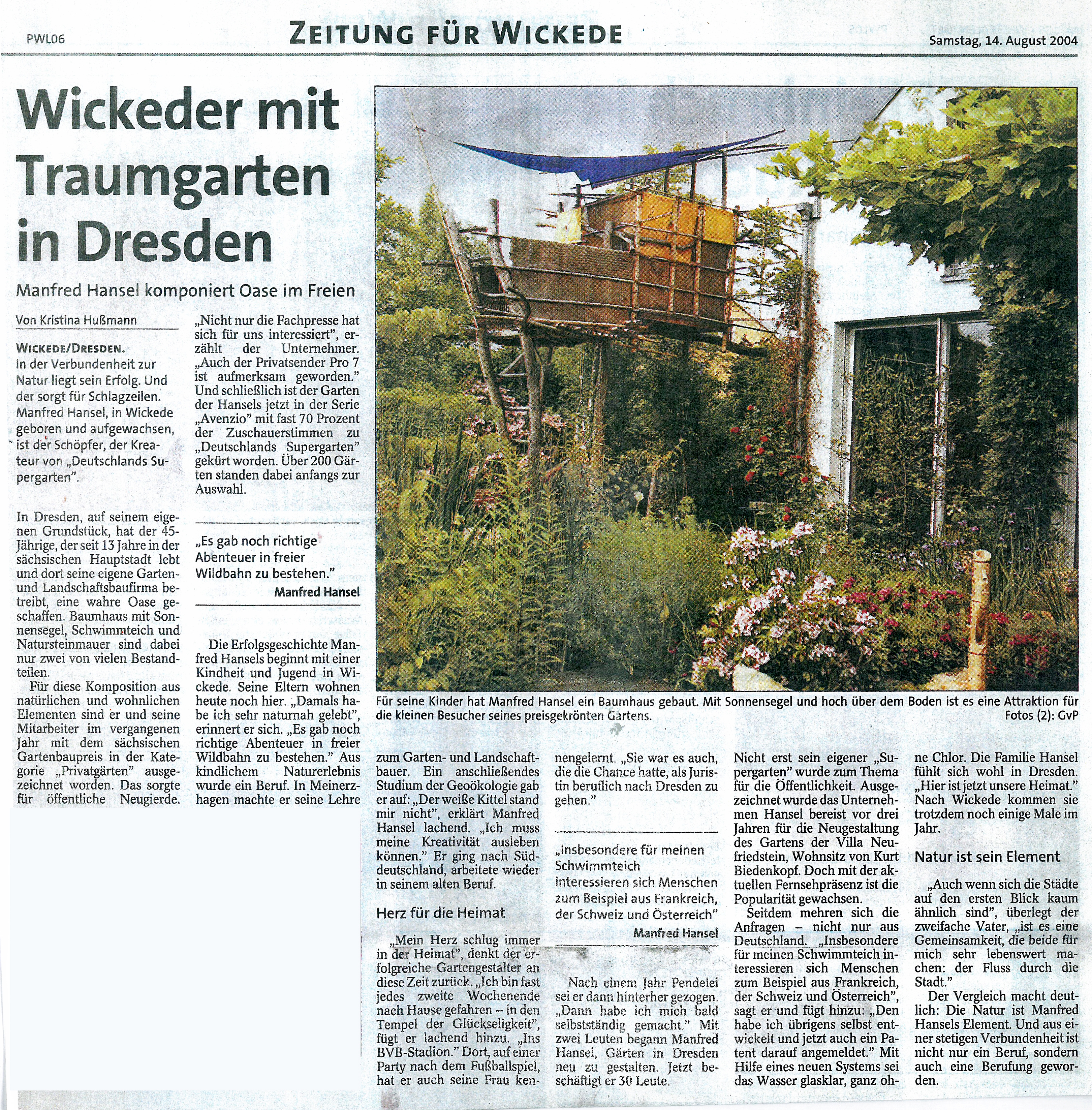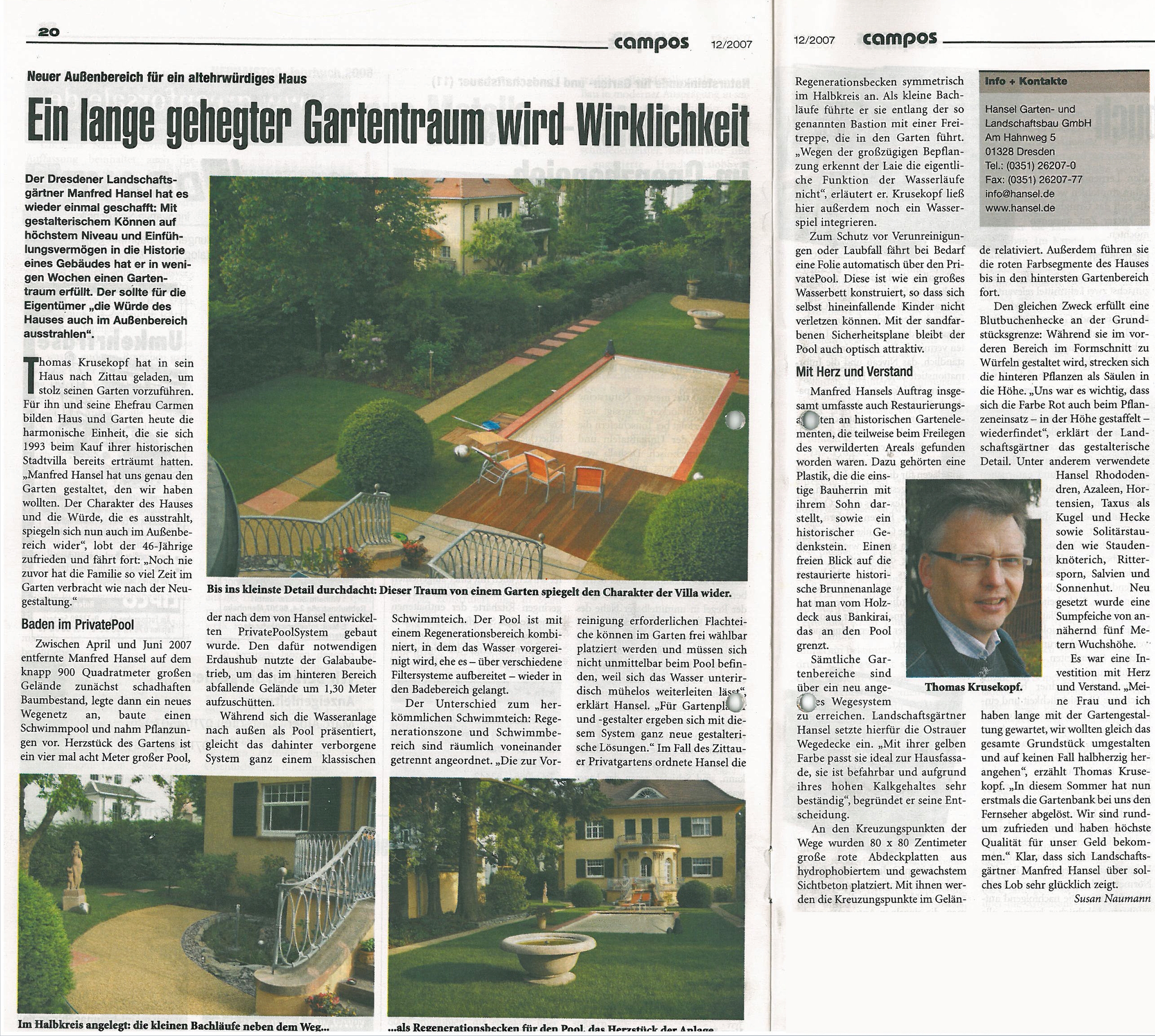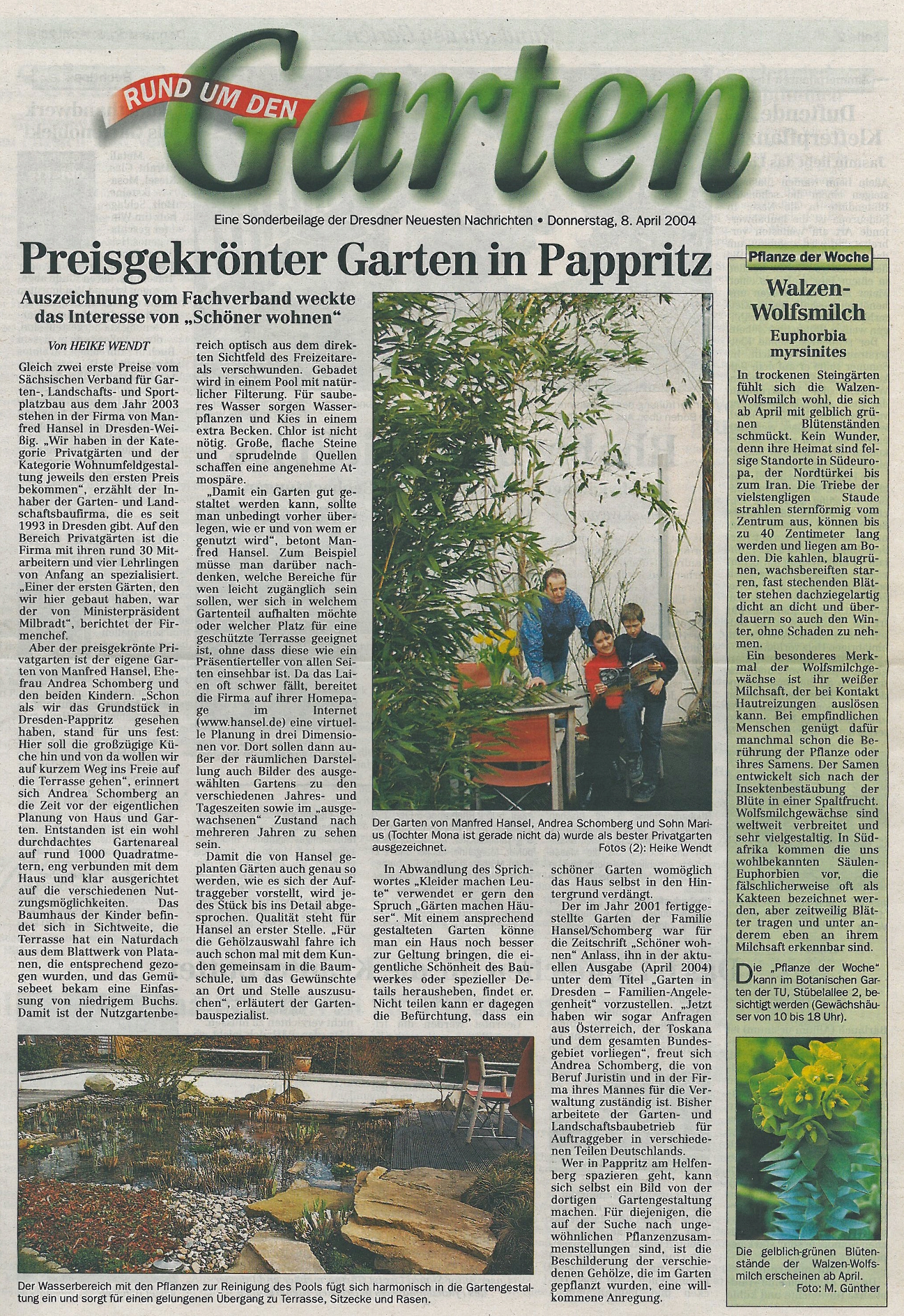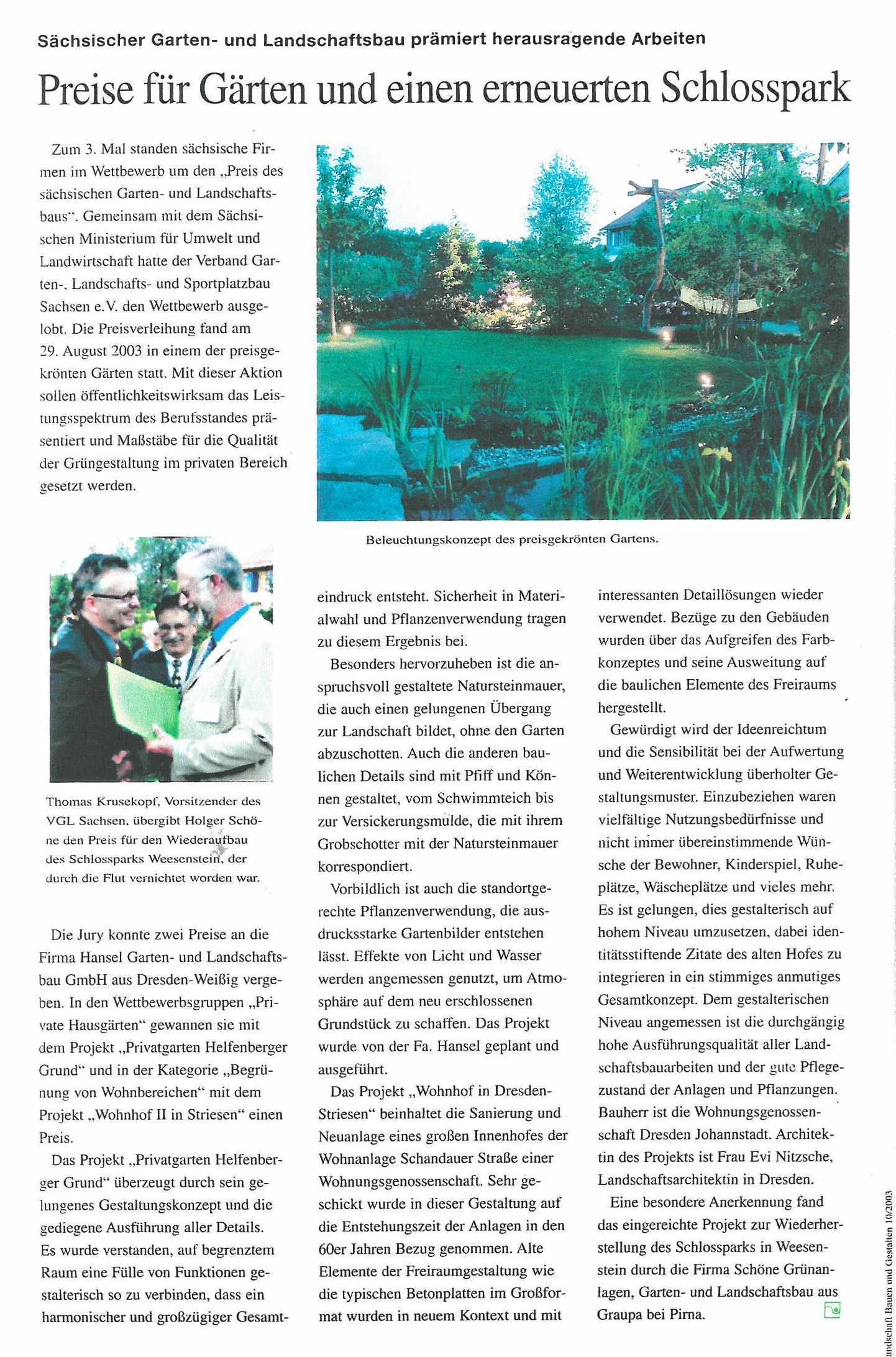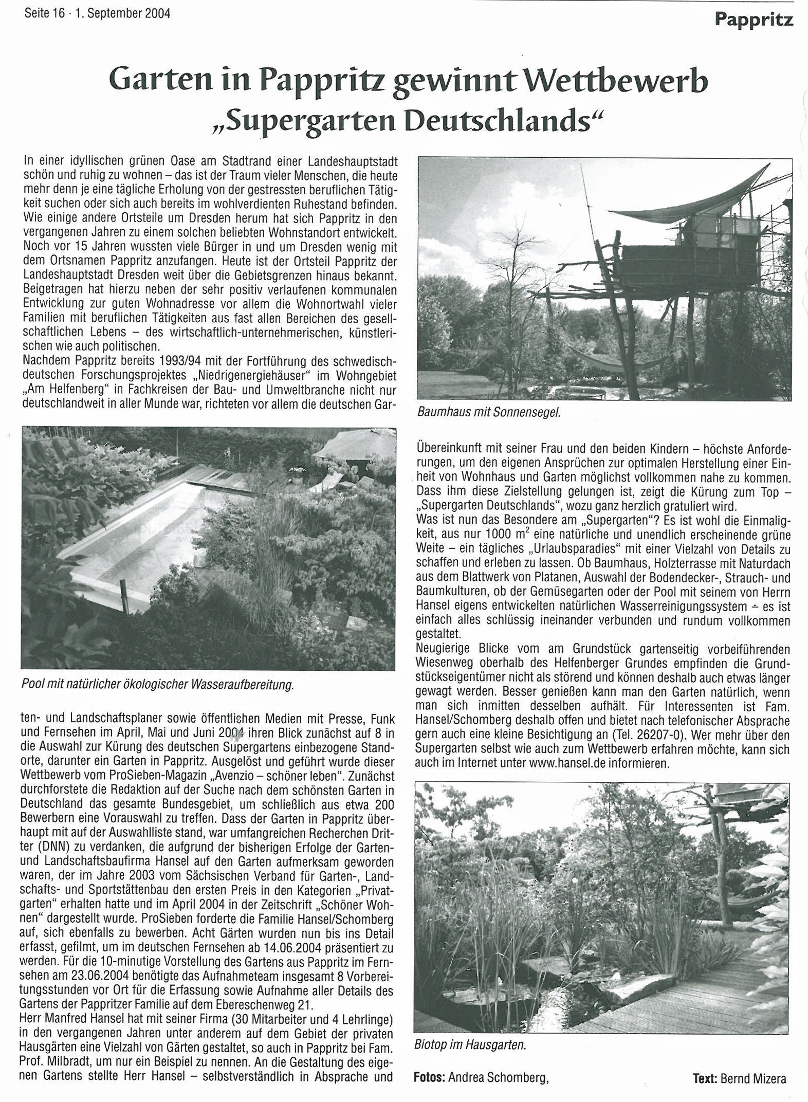 Presse Ruhe auf Frieden, Sächsische Zeitung – online, 08.09.2017 Canalettoblick Dresden, 2016 PrivatePool Seite 2 PrivatePool Seite 1 Preis des sächs. Garten- und Landschaftsbaues für Hansel Sonderpreis „Gartensanierung Mehrfamilienhaus“ 2013 1.Preis und Sonderpreis Kategorie „Außenanlagen des Wohn- und Arbeitsumfeldes“, 2016 Neue Landschaft 1208 Seite 1 Neue Landschaft 1208 Seite 2 1.Preis Berichterstattung DNN 24.10.2008 Presse Preis des sächs.GalaBaus TeilenE-MailFacebook
