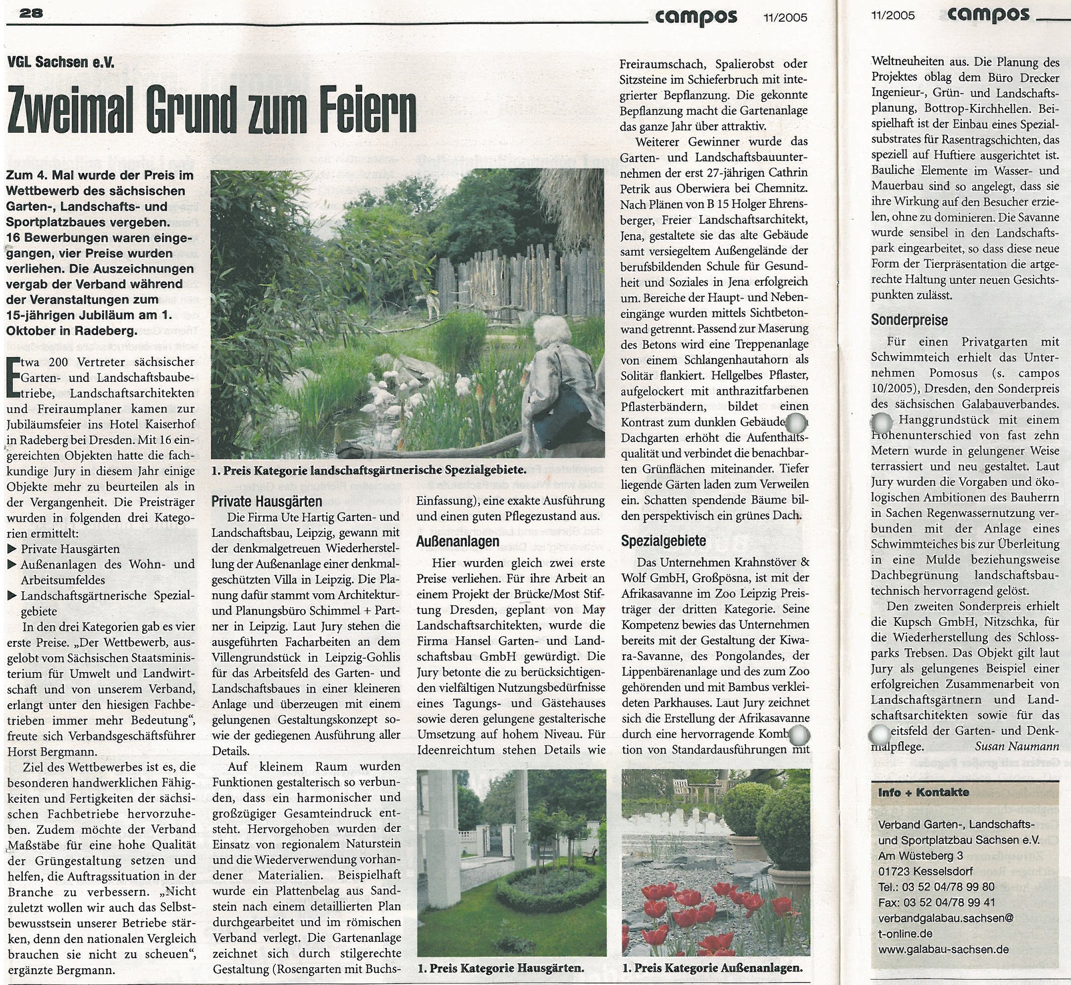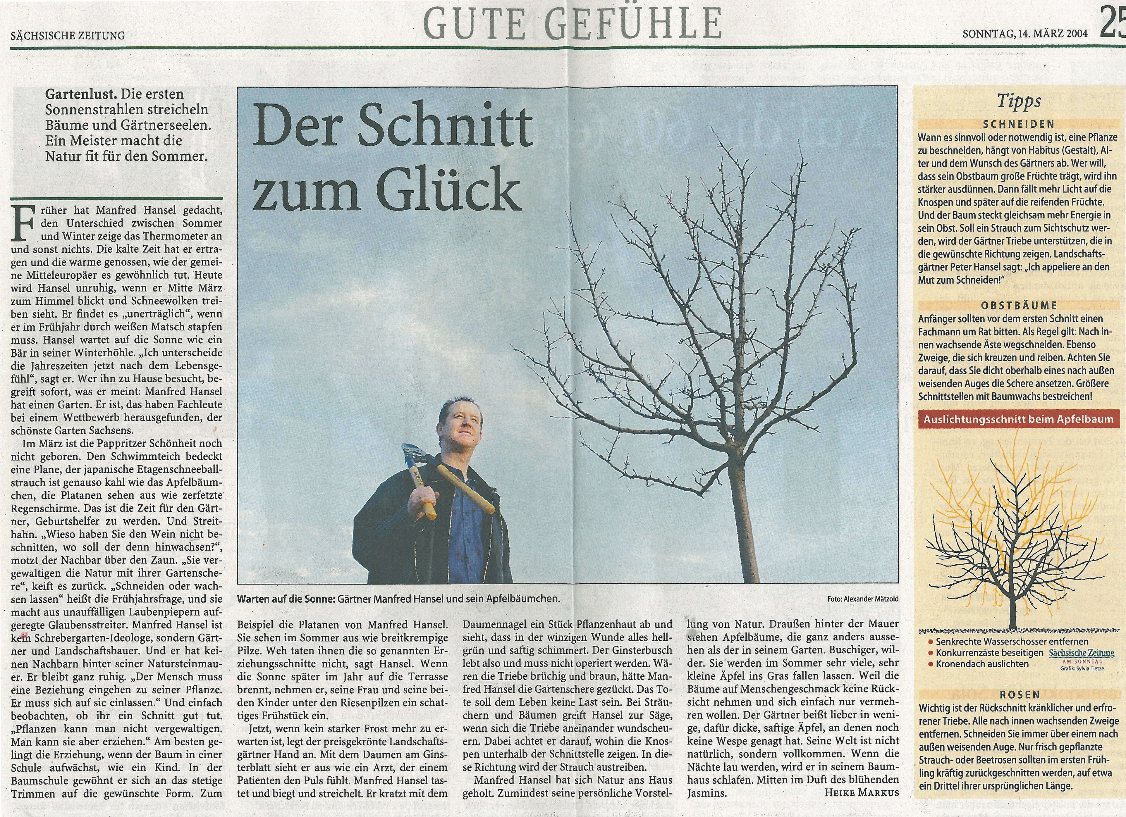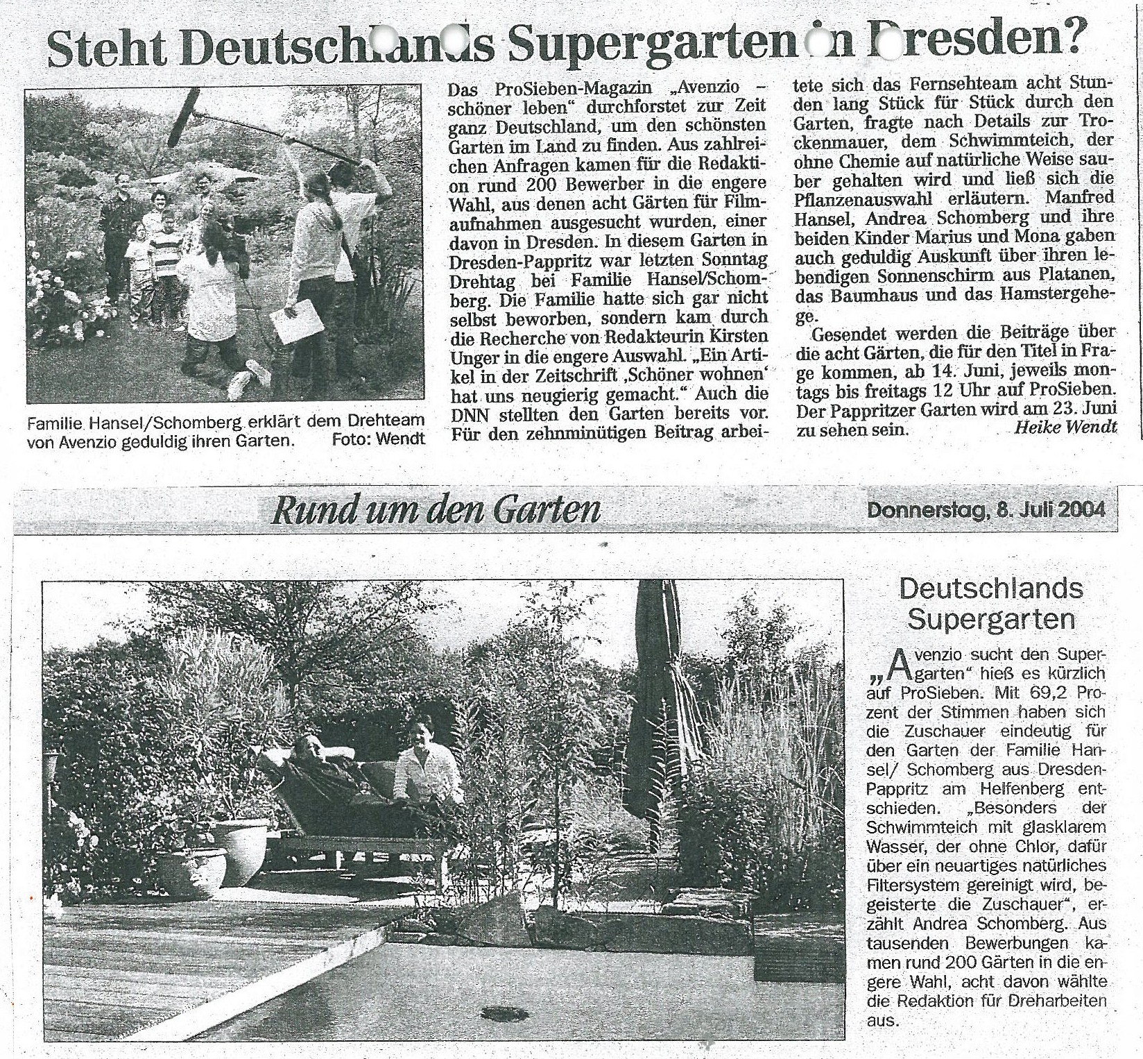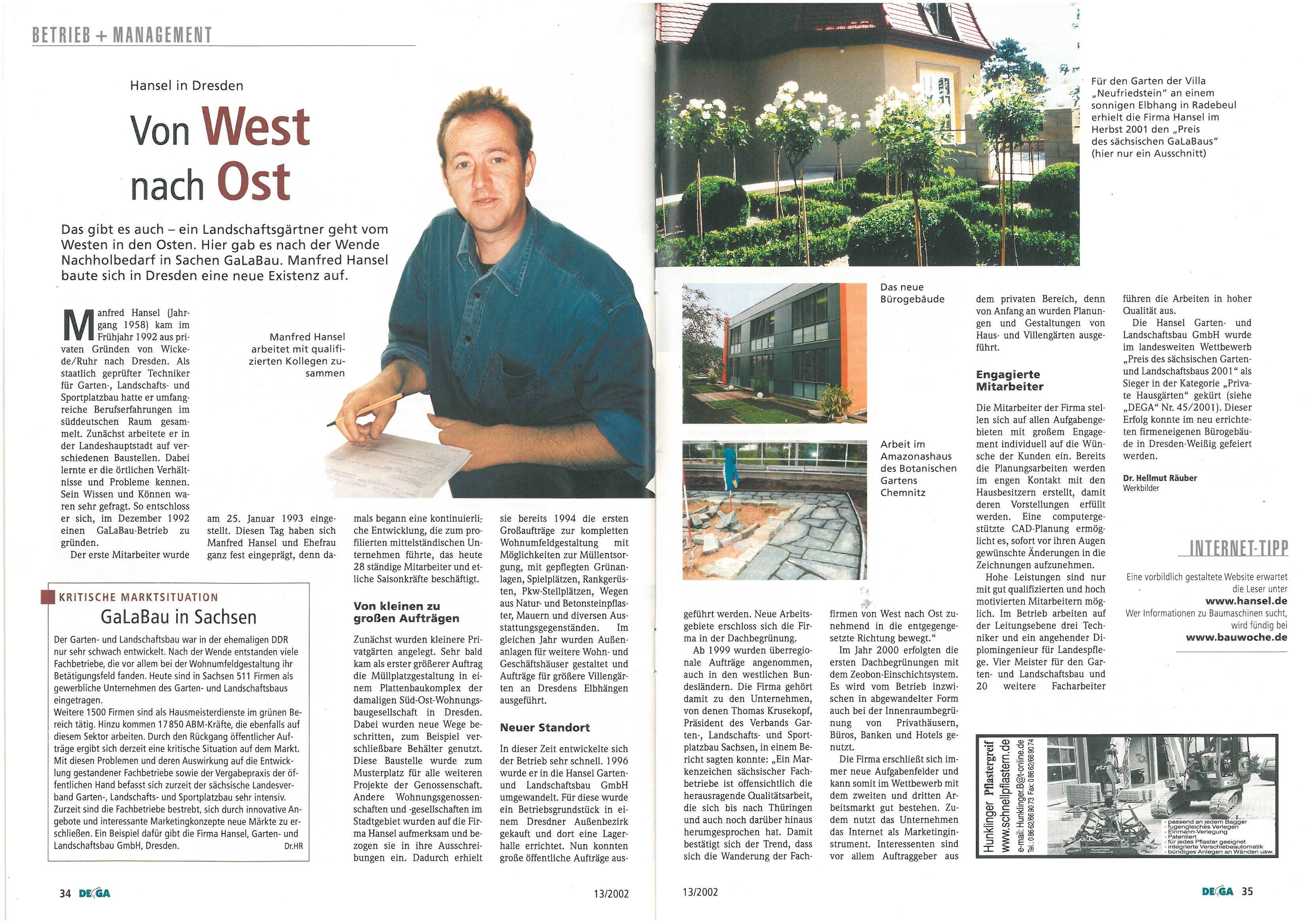 Presse Ruhe auf Frieden, Sächsische Zeitung – online, 08.09.2017 Canalettoblick Dresden, 2016 PrivatePool Seite 2 PrivatePool Seite 1 Preis des sächs. Garten- und Landschaftsbaues für Hansel Sonderpreis „Gartensanierung Mehrfamilienhaus“ 2013 1.Preis und Sonderpreis Kategorie „Außenanlagen des Wohn- und Arbeitsumfeldes“, 2016 Neue Landschaft 1208 Seite 1 Neue Landschaft 1208 Seite 2 1.Preis Berichterstattung DNN 24.10.2008 Presse Preis des sächs.GalaBaus TeilenE-MailFacebook