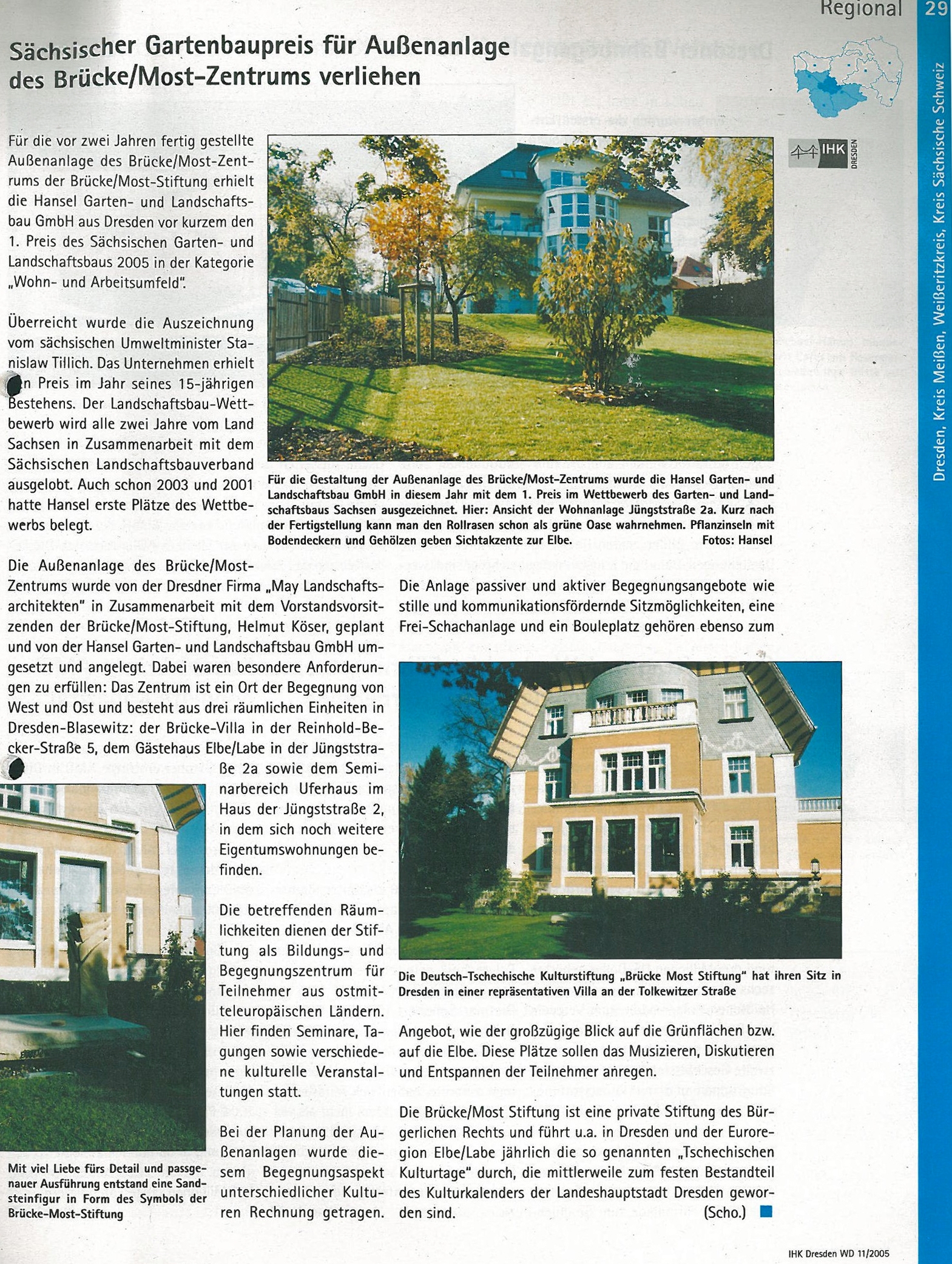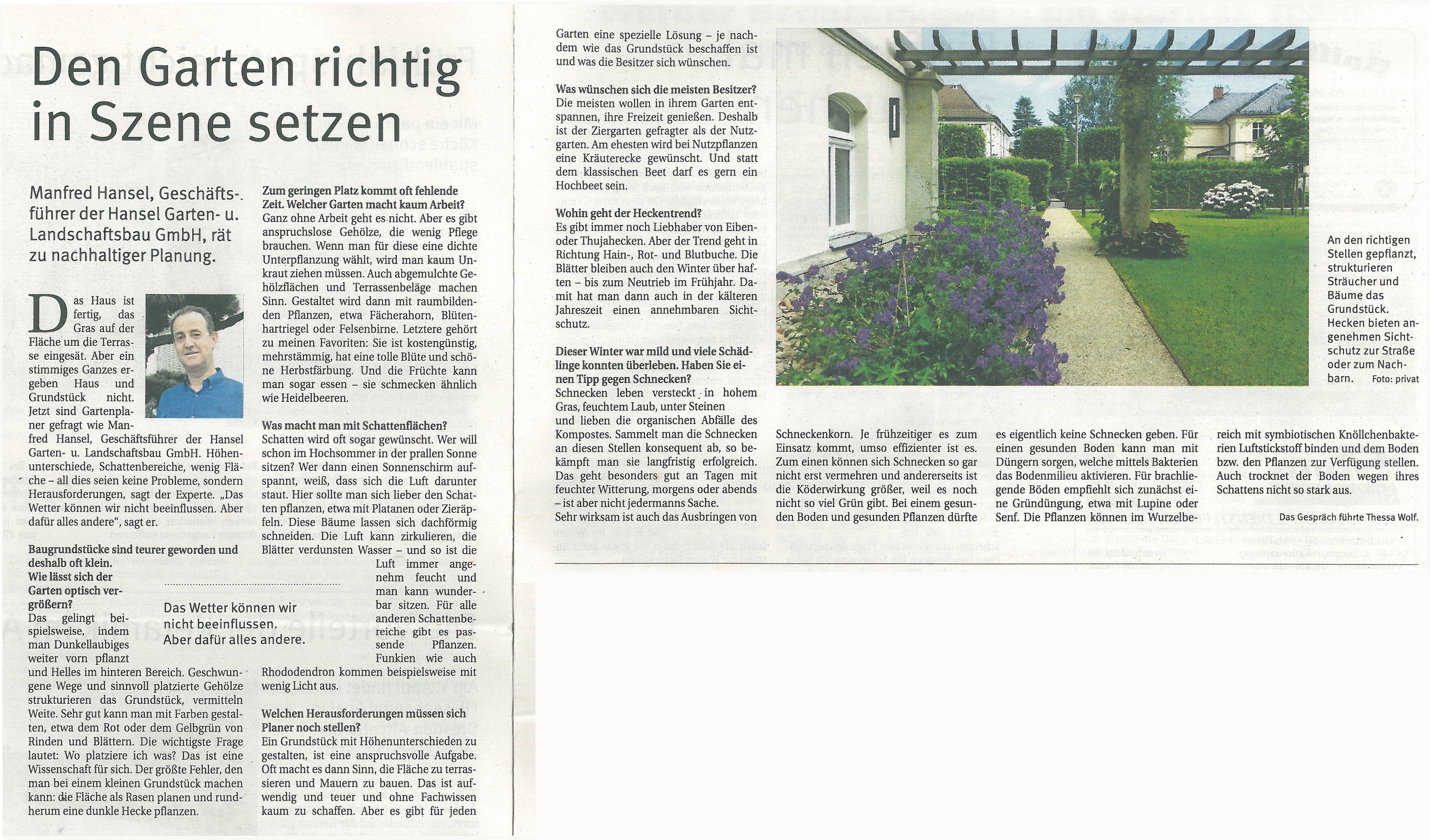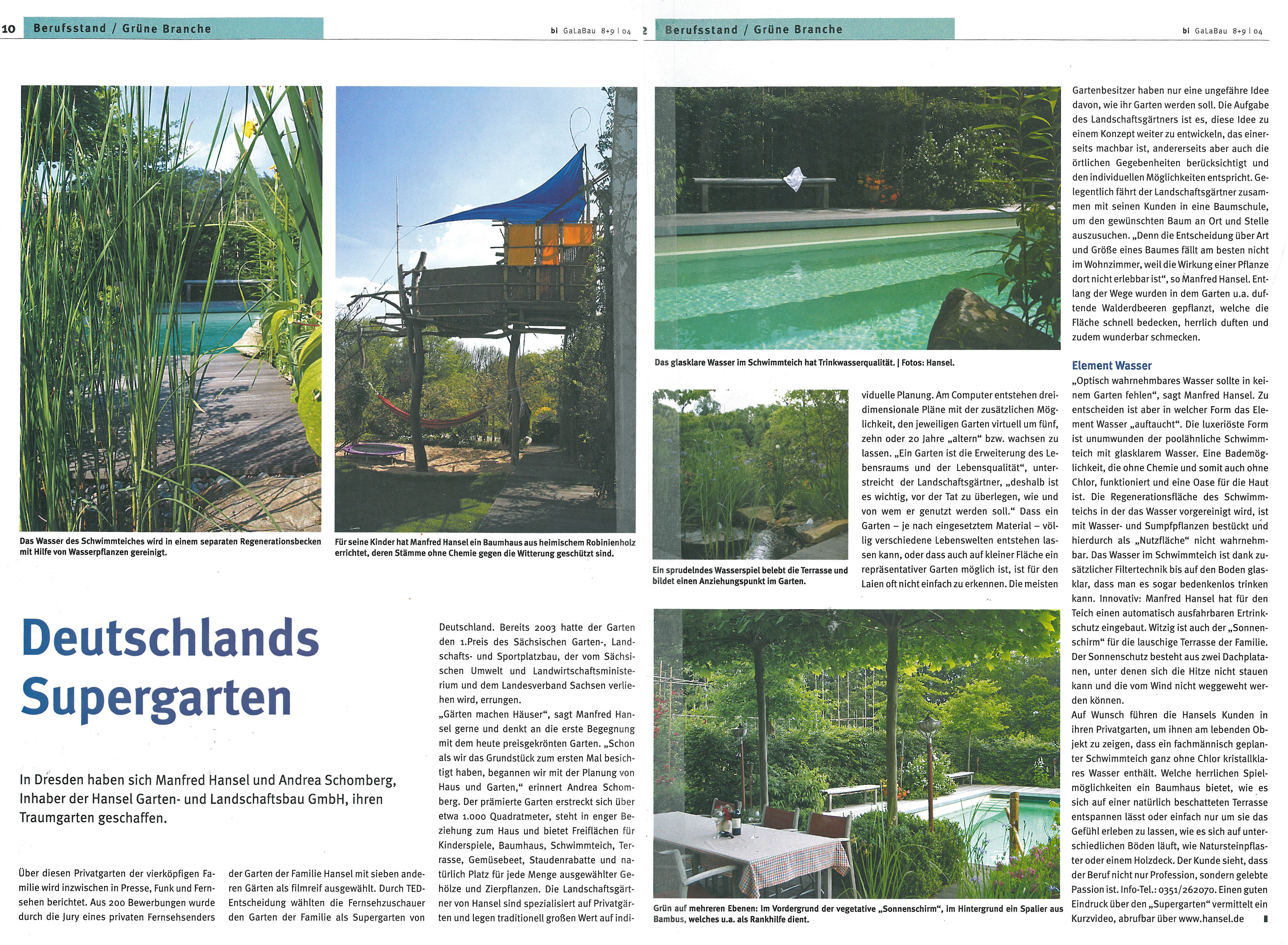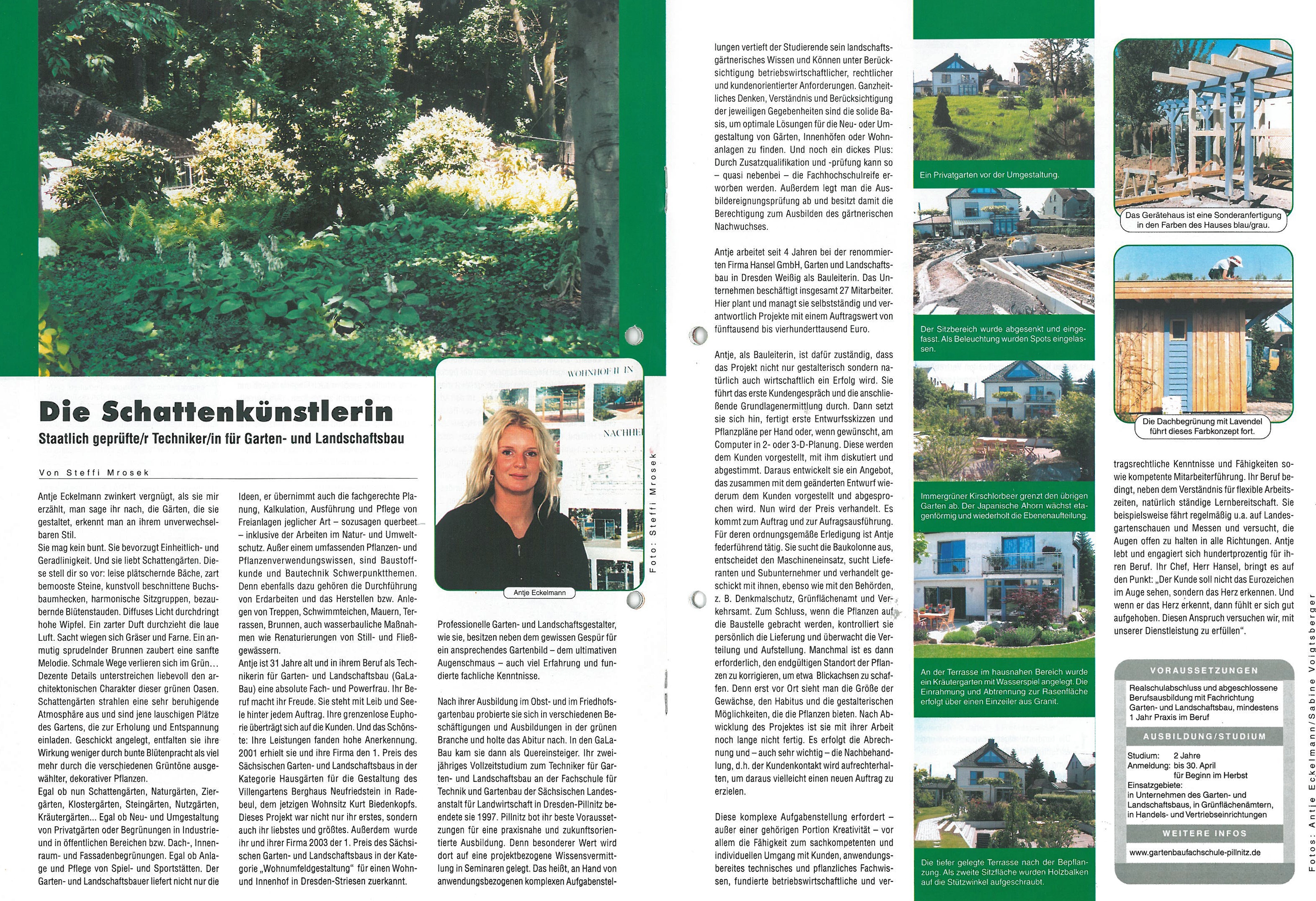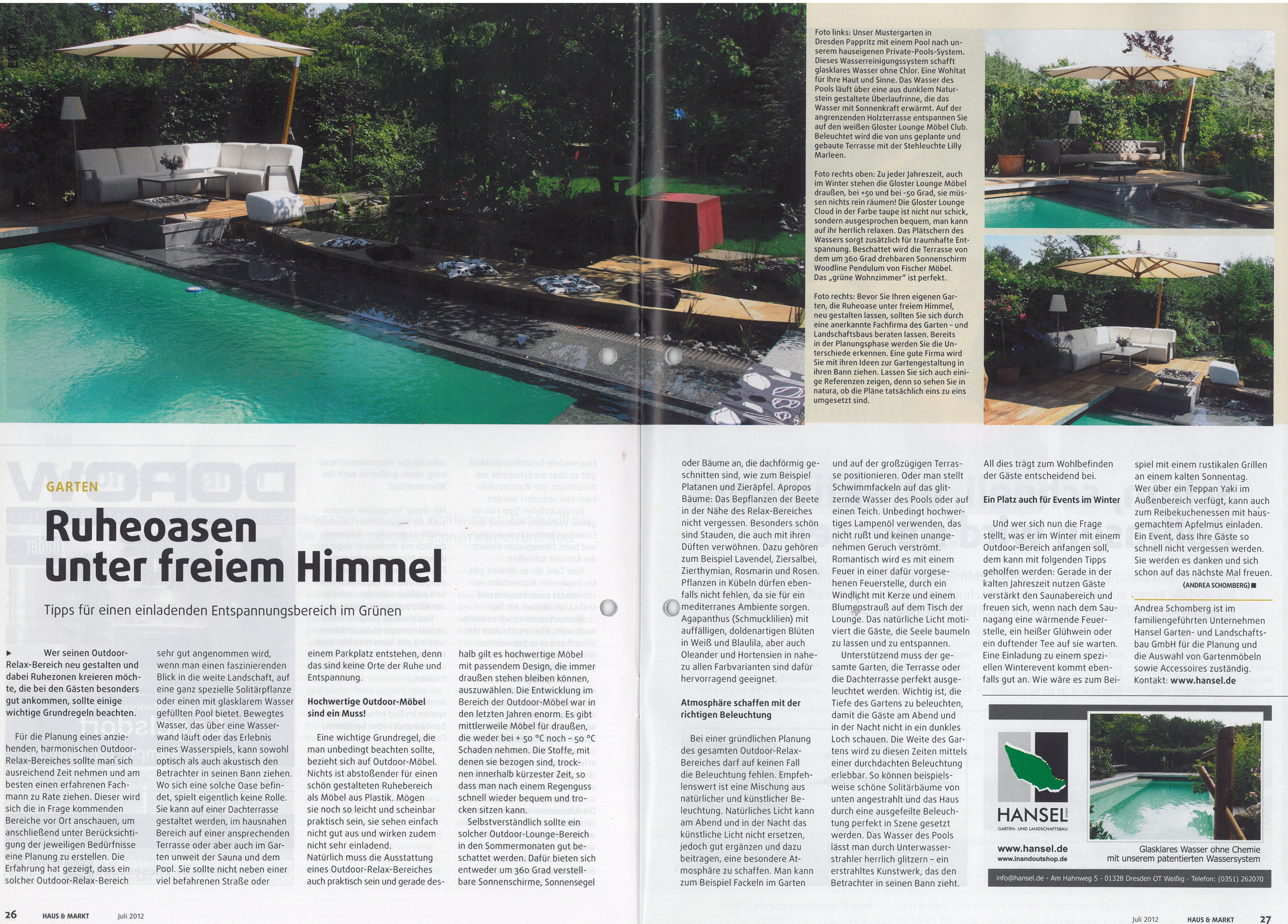 Presse Ruhe auf Frieden, Sächsische Zeitung – online, 08.09.2017 Canalettoblick Dresden, 2016 PrivatePool Seite 2 PrivatePool Seite 1 Preis des sächs. Garten- und Landschaftsbaues für Hansel Sonderpreis „Gartensanierung Mehrfamilienhaus“ 2013 1.Preis und Sonderpreis Kategorie „Außenanlagen des Wohn- und Arbeitsumfeldes“, 2016 Neue Landschaft 1208 Seite 1 Neue Landschaft 1208 Seite 2 1.Preis Berichterstattung DNN 24.10.2008 Presse Preis des sächs.GalaBaus TeilenE-MailFacebook